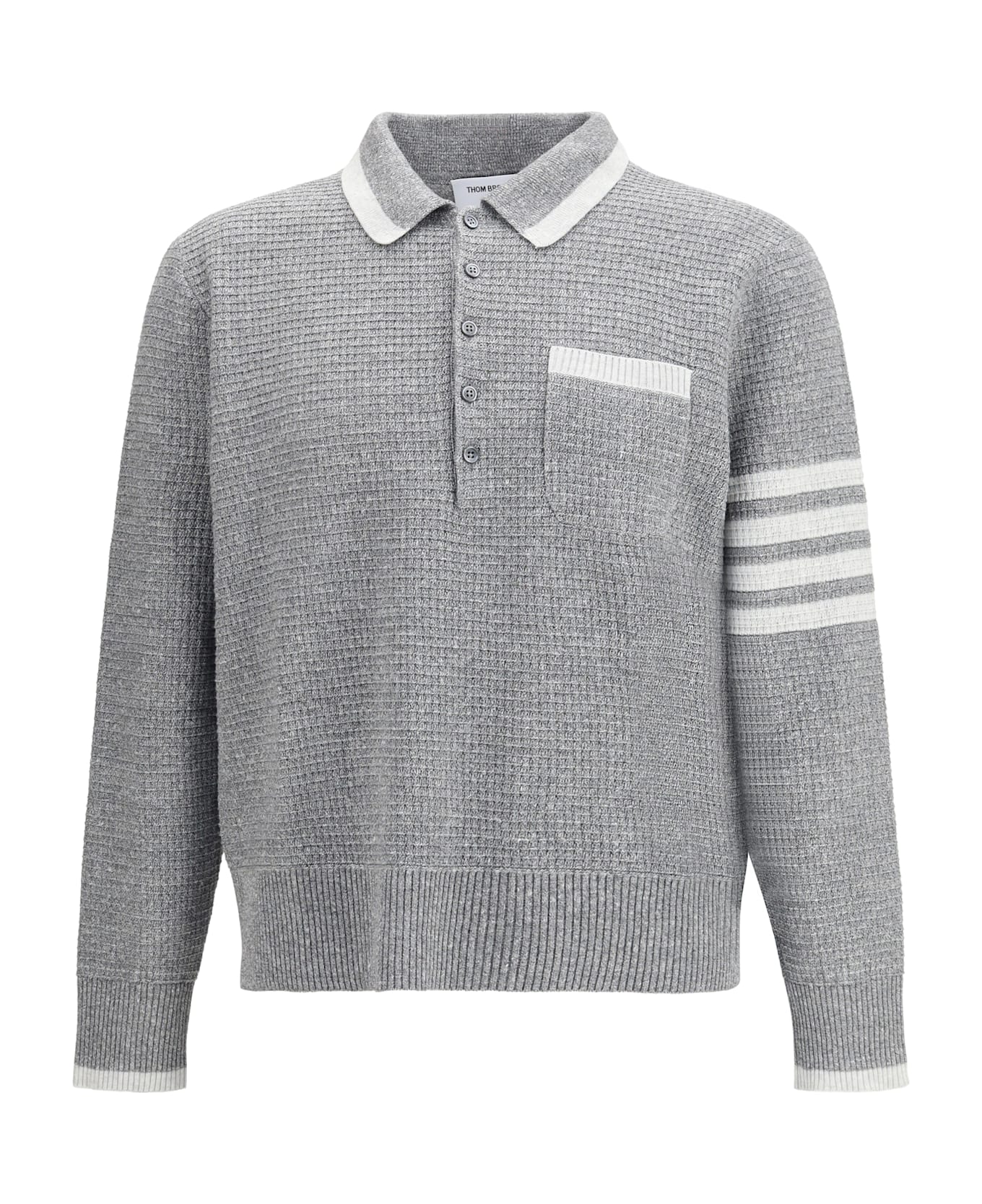 The knitted polo shirt by thom browne delivers relaxed elegance enhanced by iconic detailing. crafted from a refined wool and silk blend, it features a textured knit that adds depth and character to the design. the long-sleeved silhouette is finished with the signature four-bar stripe on the sleeve, while a chest pocket and button fastening balance functionality with style. a ribbed hem completes the piece with a clean and structured finish.