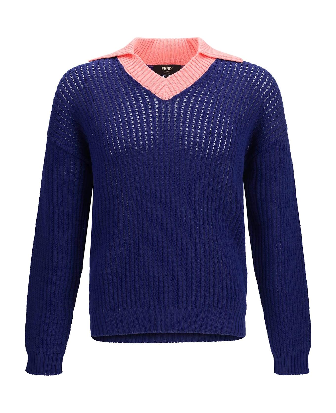 The ribbed v-neck sweater with ff motif by fendi is an elegant cotton piece, featuring a double-layer effect and the iconic ff jacquard pattern across the entire surface. the design includes long sleeves, a collar and contrasting ribbed trims, and a straight hem, with a regular fit, making it perfect for a sophisticated and contemporary look.