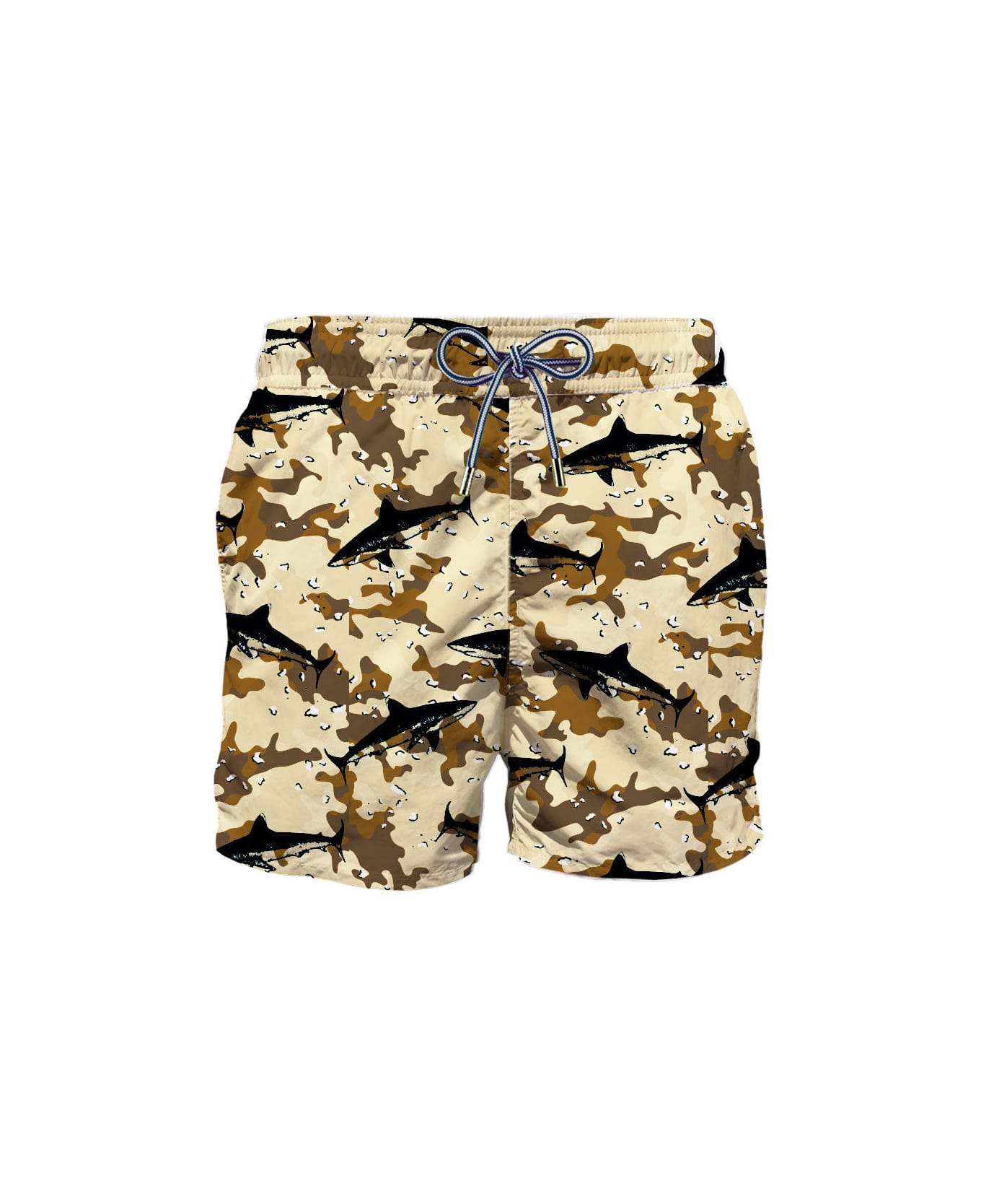 Flock Fabric Shark On Camouflage Background Swim Shorts