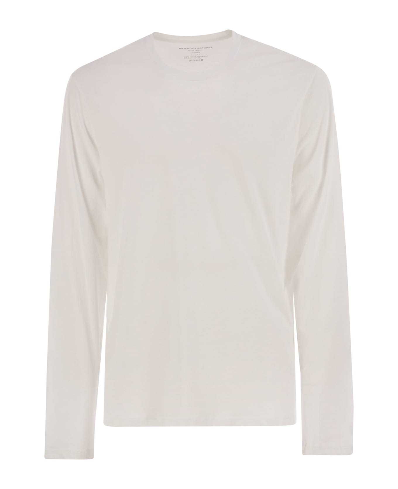 Basic crew-neck T-shirt with long sleeves and slim fit: a simple and versatile passepartout garment. The cotton and elastane composition makes this shirt precious and comfortable, perfect to be combined with other garments or worn alone for an essential look. An essential and basic material, made precious and luxurious thanks to a special weaving process using only the finest fibres. Cotton is processed with elastane to add extra comfort and softness to the composition. - Long sleeves - Crew neck - Slim fit DESIGNER ID: S25M090HTS020 001