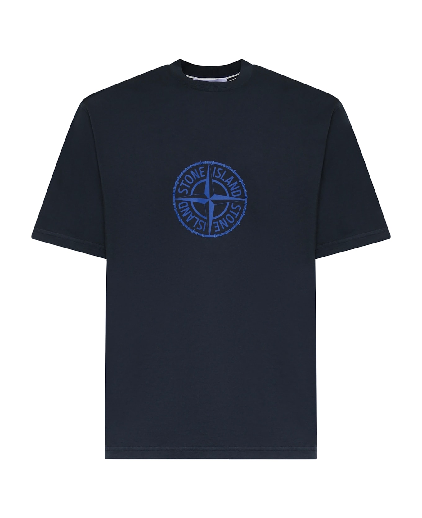 - Made of organic cotton jersey - Crew neck - Short sleeves - Print on the front - Regular fit - Size shown is M - Color: Navy