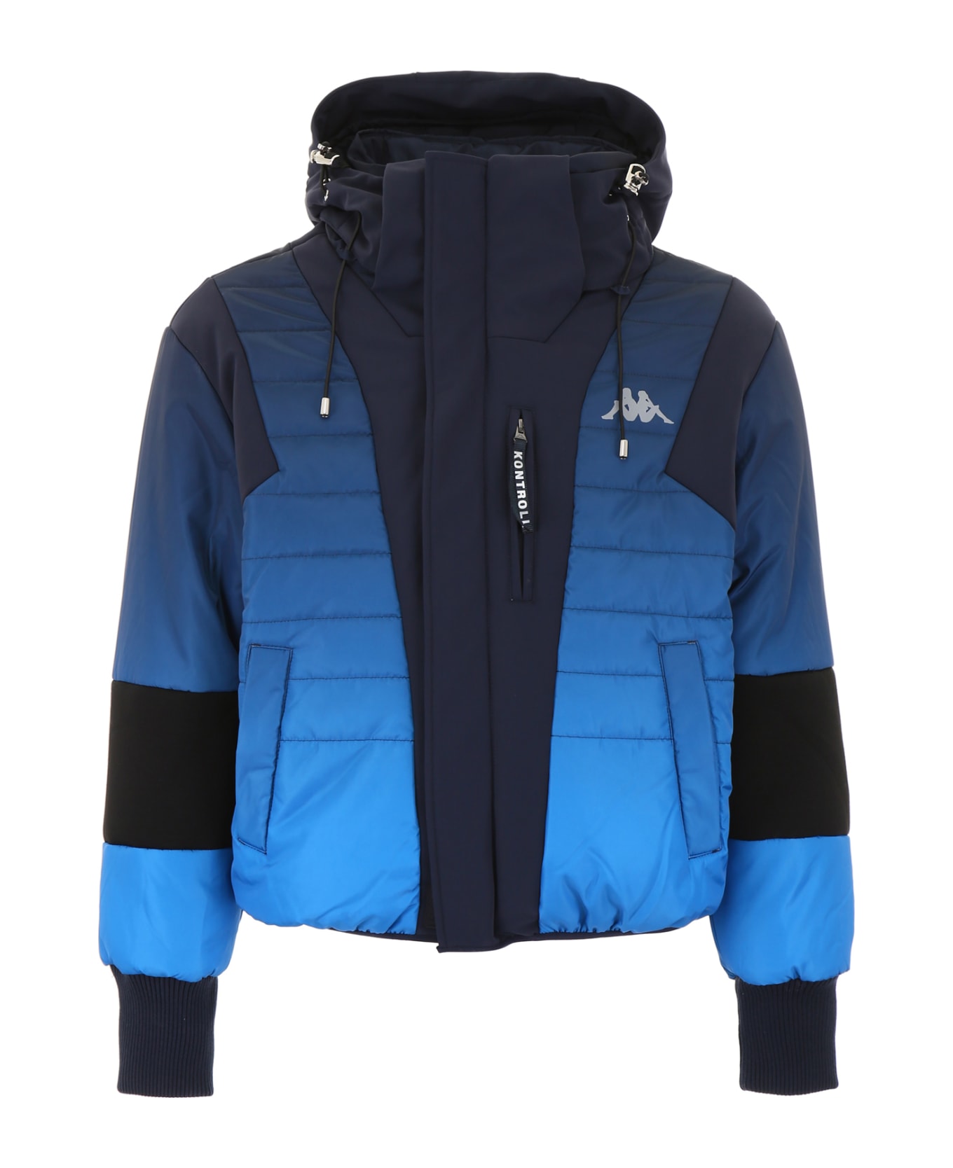 Kappa Kontroll color block jacket with removable hood. It features a concealed zip and velcro closure, two front pockets with snap button, zipped openings under the sleeves. Techno twill lining with inside pocket. Model height is 182 cm and he is wearing a size M.