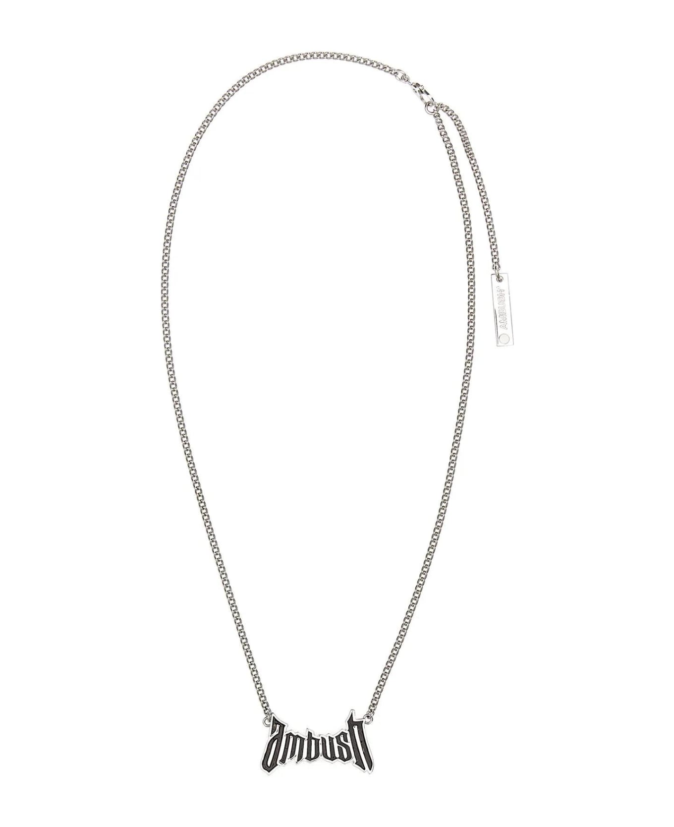 Necklace realized in silver-tone plate metal enriched by logoed enameled metal logoed plate and metal logoed plate.