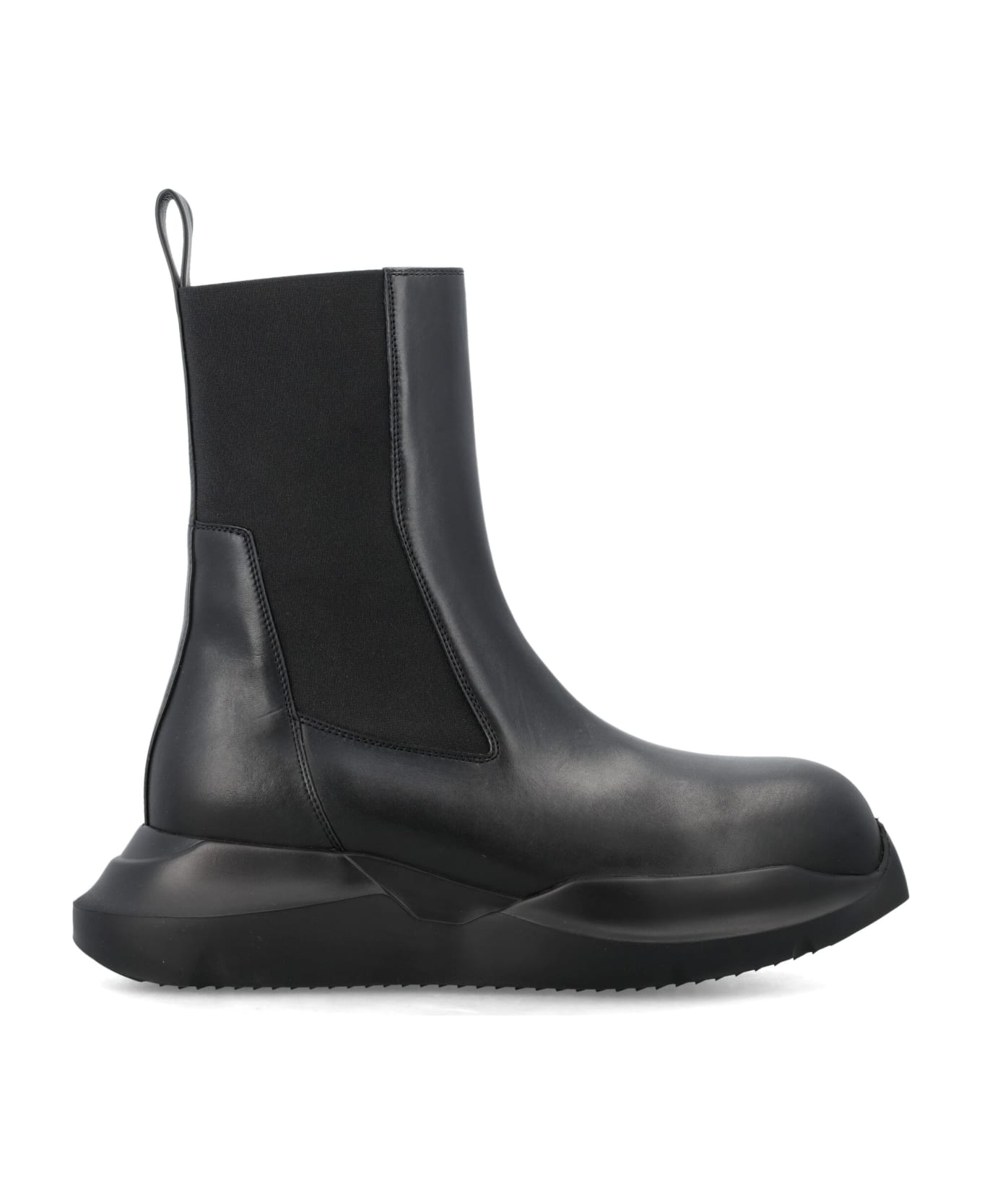 Leather Geth Beatle Boot By Rick Ownens. Featuring: Stretch Elastic Side Panels Pull Tabs Geth Thick Sole With An Angled Extended Heel Round Toe