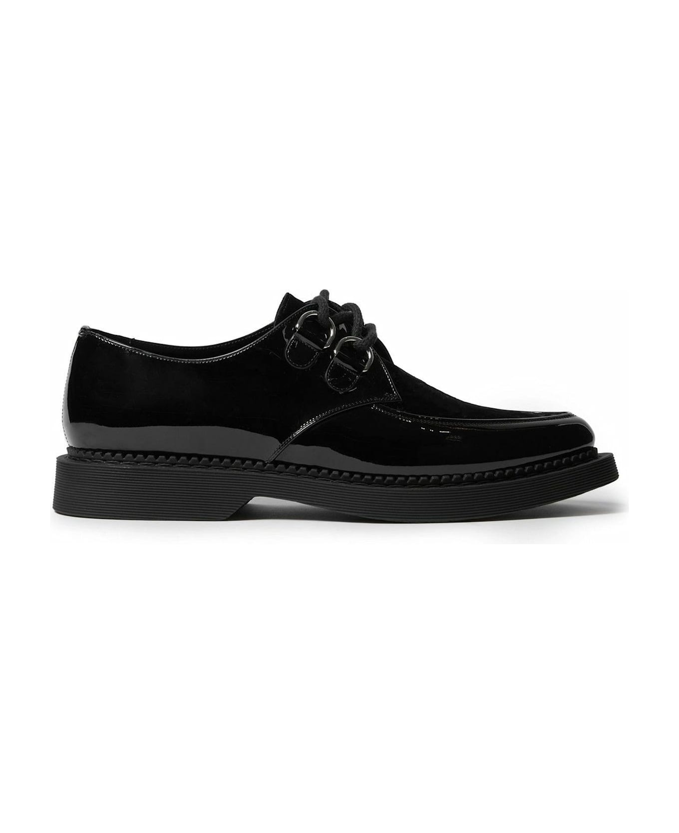 Composition: 100% calf leather Inner: Leather Insole: Leather Sole: Rubber Patent effect Branded insole Almond toe Laceup fastening Dust bag and certificate not included Made in Italy