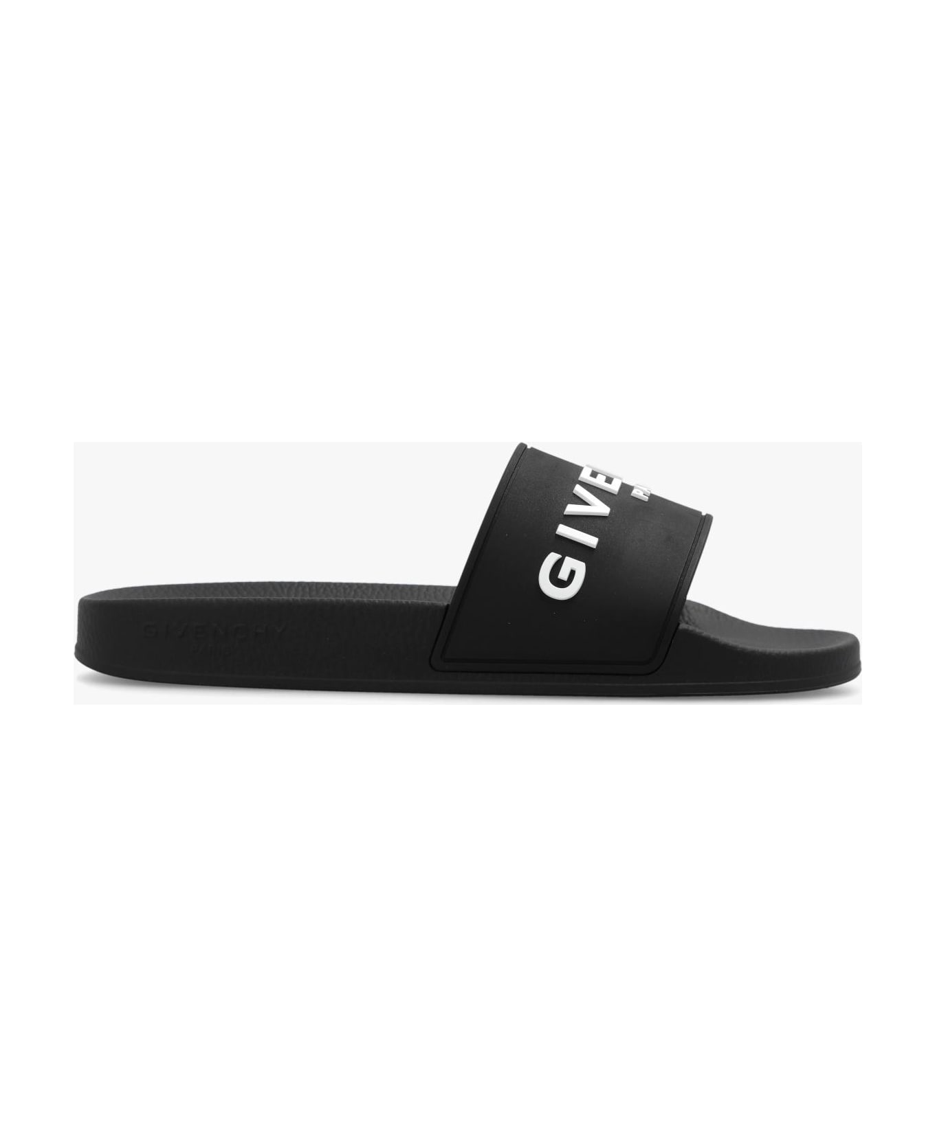 Black slides from Givenchy. Made of rubber, this pair features a white logo pattern and black rubber sole.
