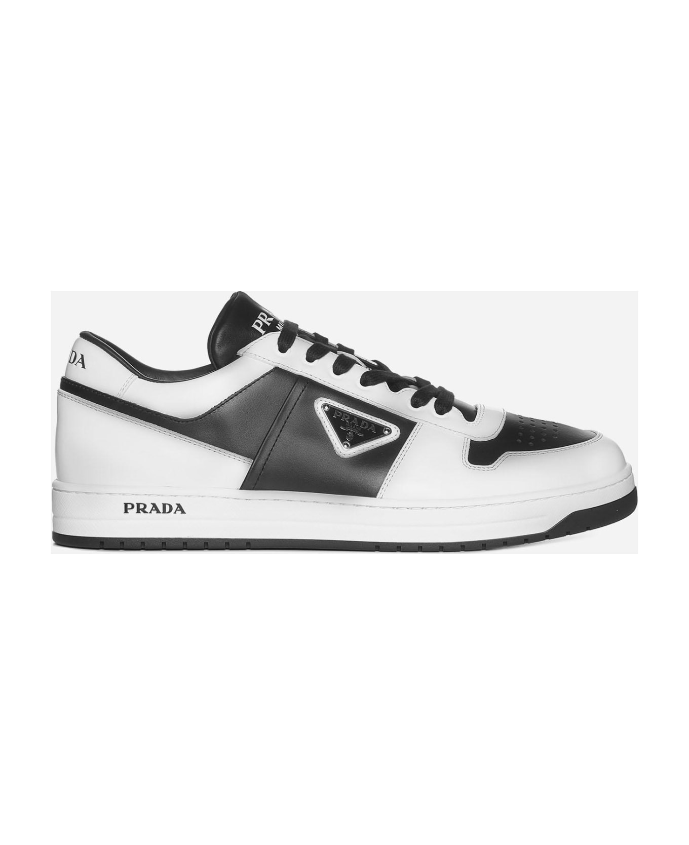 Prada's Downtown white and black leather sneakers featuring logo on the tongue, laces fastening, round toe, side triangle logo plaque, back logo print and rubber sole with logo embossed on the side. Composition: 100% calfskin