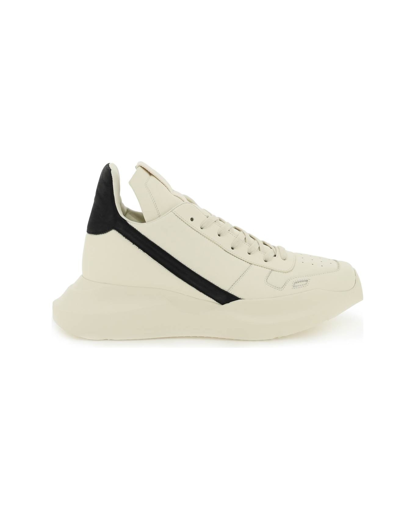 Geth Runner sneakers by Rick Owens with soft smooth leather upper characterized by the contrasting heel tab. Grosgrain loop tab on the tongue and padded back. Leather lining with removable insole and maxi rubber sole with squared toe and bulging back.