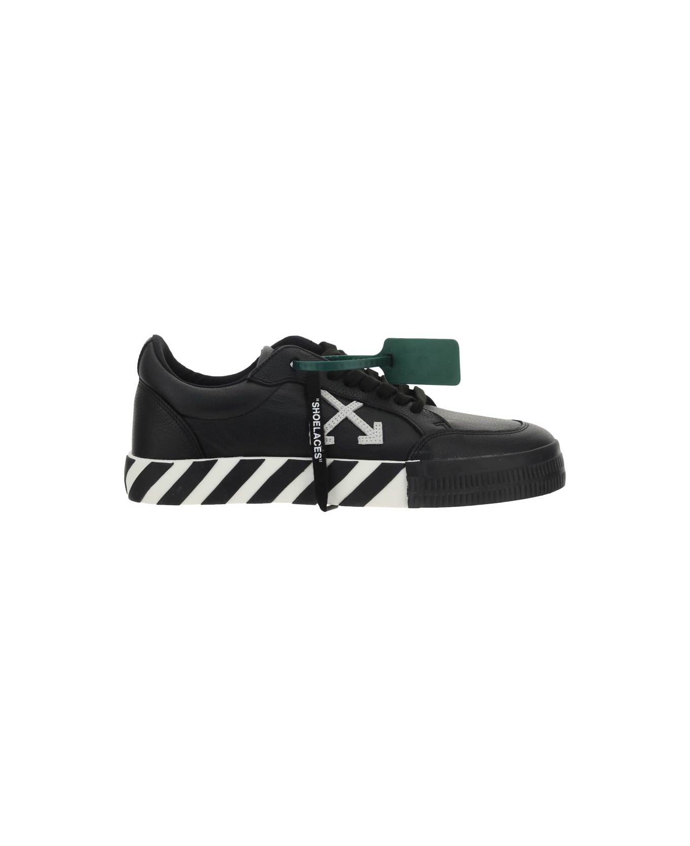 Calfskin low vulcanized sneakers by off-white, iconic zipper tie tag on front, front lace-up closure, contrasting brand logo on outer side panel, iconic brand signature printed on front tab, sole with iconic two-tone slanted bands.