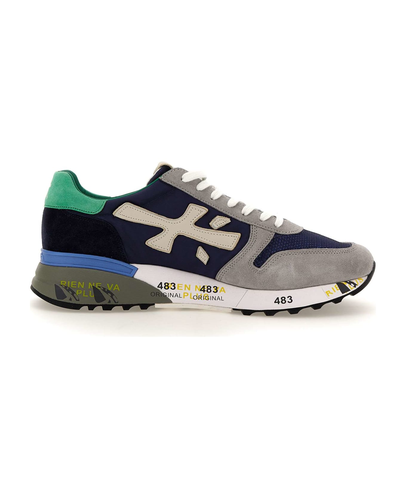 "Mase 6165" Premiata men's suede with nylon insert sneakers, grey and blue with contrasting multicolor details, flat white laces, logo on tongue, side and back, leather lining and removable insole, ergonomic sole with 4cm high lettering.