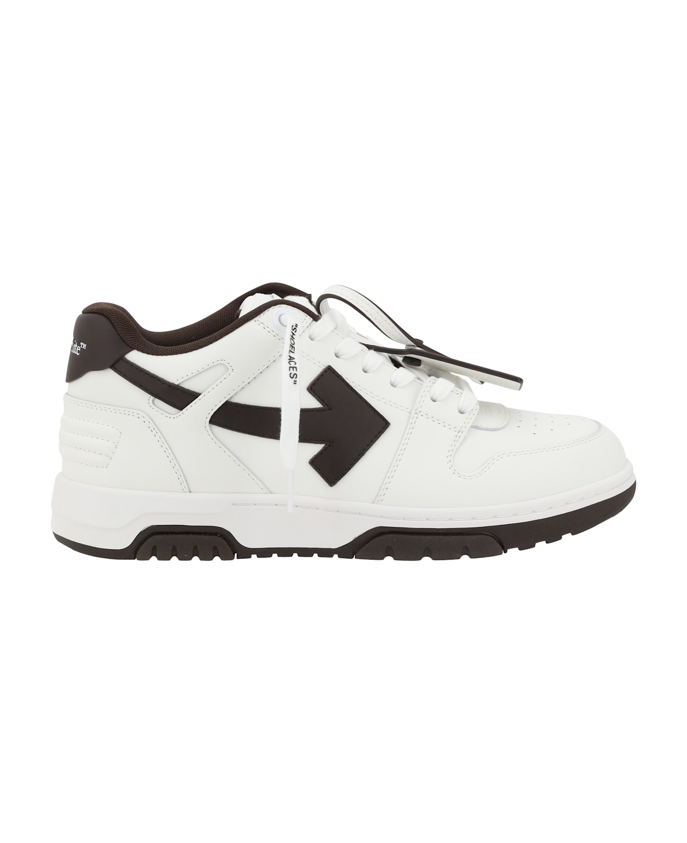 Off-white's out of office sneakers feature a perforated round toe that offers breathability and comfort. the flat sole provides stability, while the iconic embossed arrow logo on the side panel adds a distinctive touch to the design. the logo-embossed front lace-up closure allows for a customized fit, and the brand's iconic signature is pressure-printed on the back label, accentuating the brand connection. finally, the iconic zipper tie tag applied to the front laces completes the bold and recognizable look of these sneakers.
