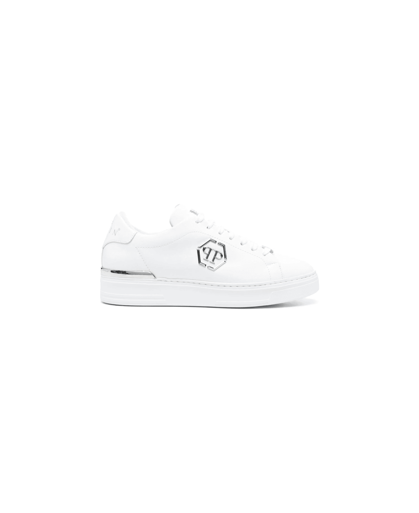 Hexagon low-top leather sneakers from PHILIPP PLEIN featuring cloud white, calf leather, silver-tone hardware, round toe, logo patch at the tongue, front lace-up fastening and flat rubber sole.