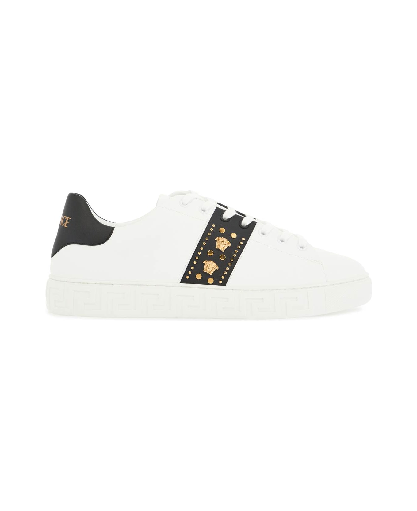 These Versace sneakers are made of eco-leather and adorned with Medusa and gold-finished studs. They feature a front lace-up closure, fabric logo patch, lined interior with removable insole, contrasting spoiler with golden lettering logo, and rubber sole with Greca pattern.