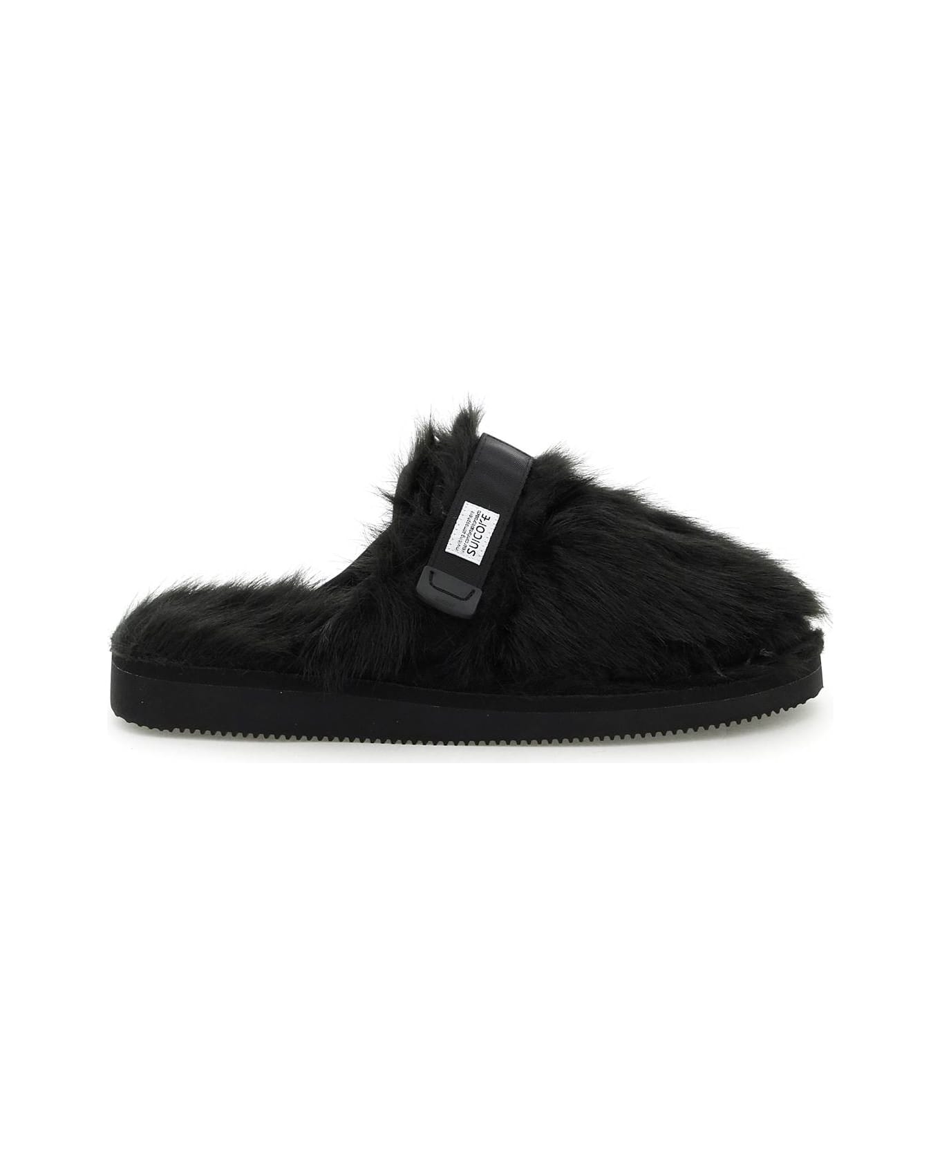 Zavo sabot by Suicoke crafted in faux fur featuring an adjustable nylon strap with velcro, plastic end detail and fabric logo patch. Fabric lining, faux fur insole, rubber sole.