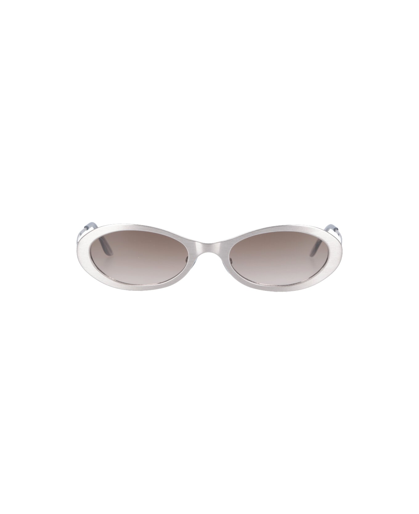 Our Legacy Tad It Bubble sunglasses in German silver, oval design, dark sun lenses, thin temples.