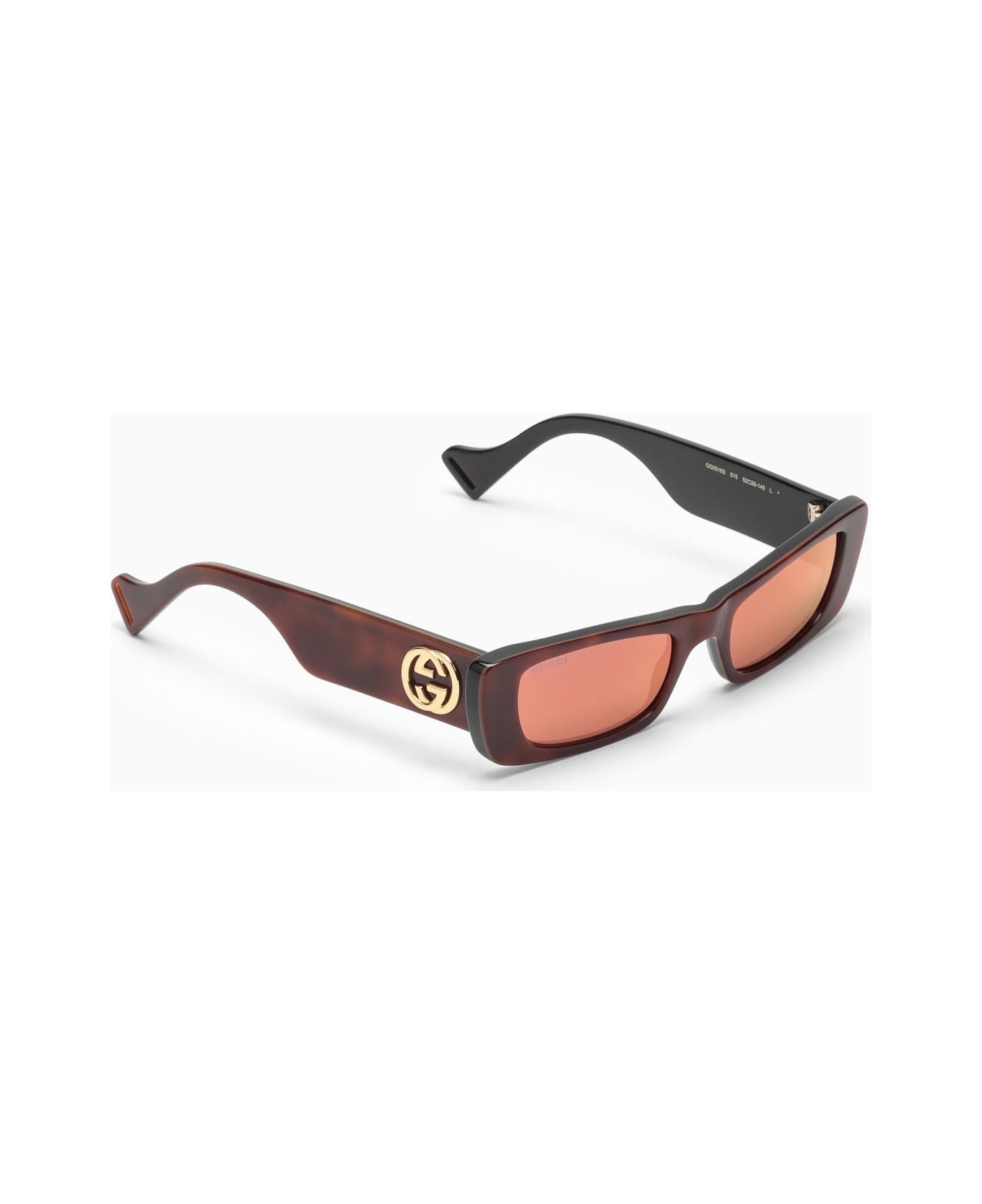 Tortoiseshell acetate sunglasses from Gucci featuring a rectangular frame, red lenses and a metal logo on the arms.