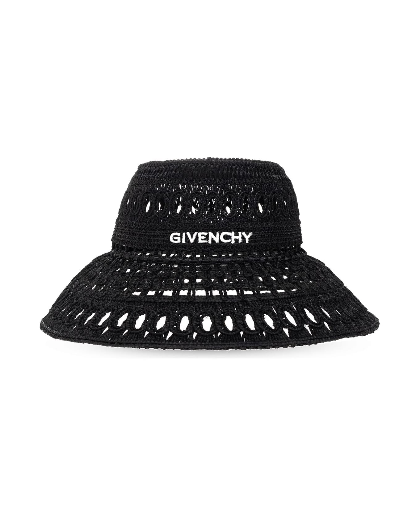 Black openwork bucket hat from Givenchy. Crafted from woven raffia, this item is decorated with a white logo embroidery.