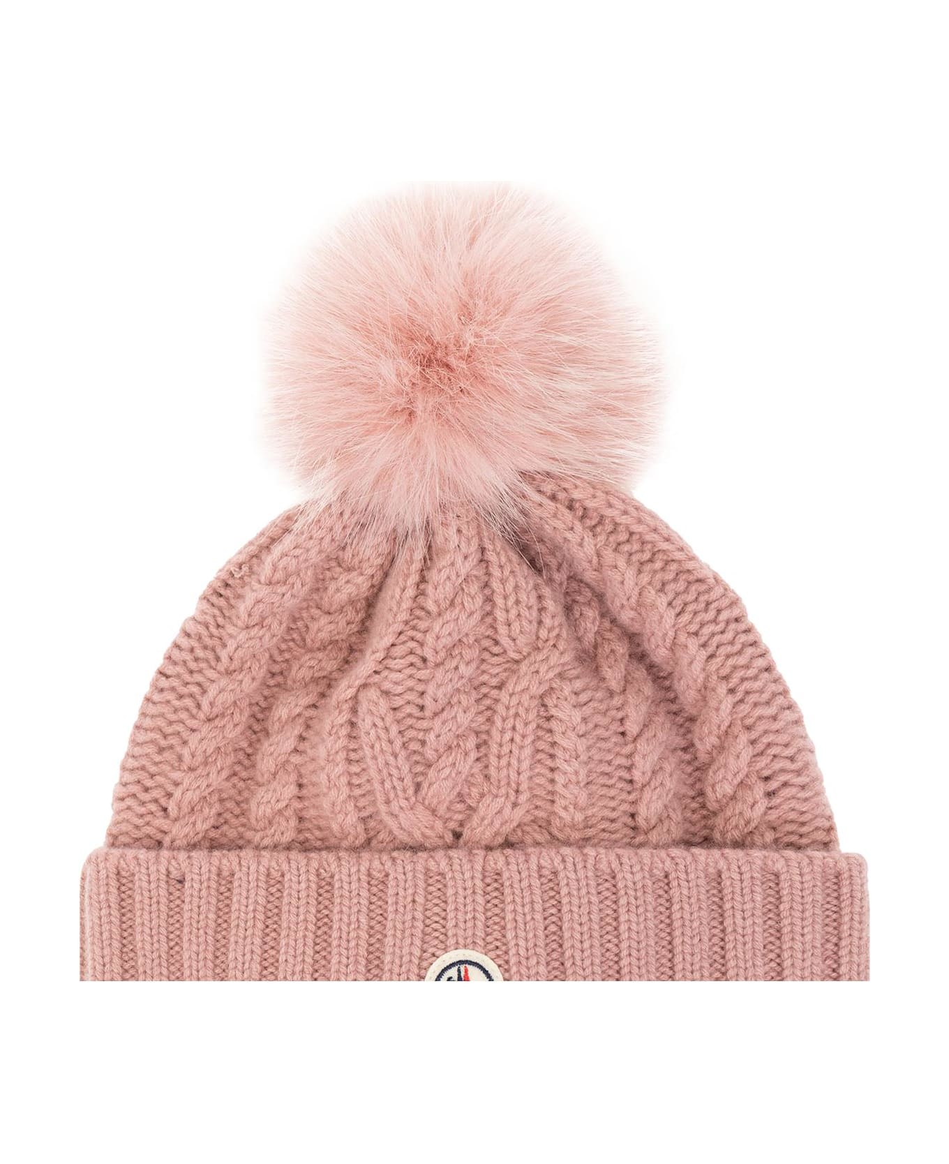 Pink pompom beanie from Moncler. Made from a virgin wool and cashmere blend with a ribbed knit, this item features a felt logo patch for brand recognition.
