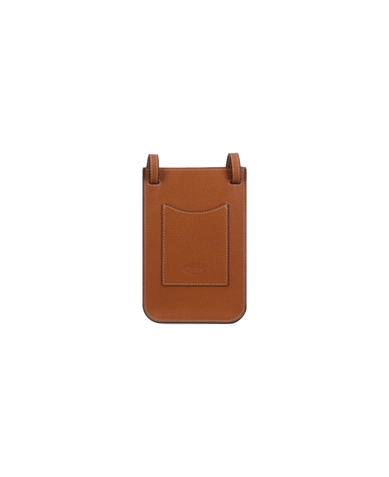 Tod s brown hammered leather logo smartphone holder with bi-fold design, shoulder strap, flat front pocket, logo detail engraved on silver metal charm, back card slot, three interior card slots, and main inner compartment.