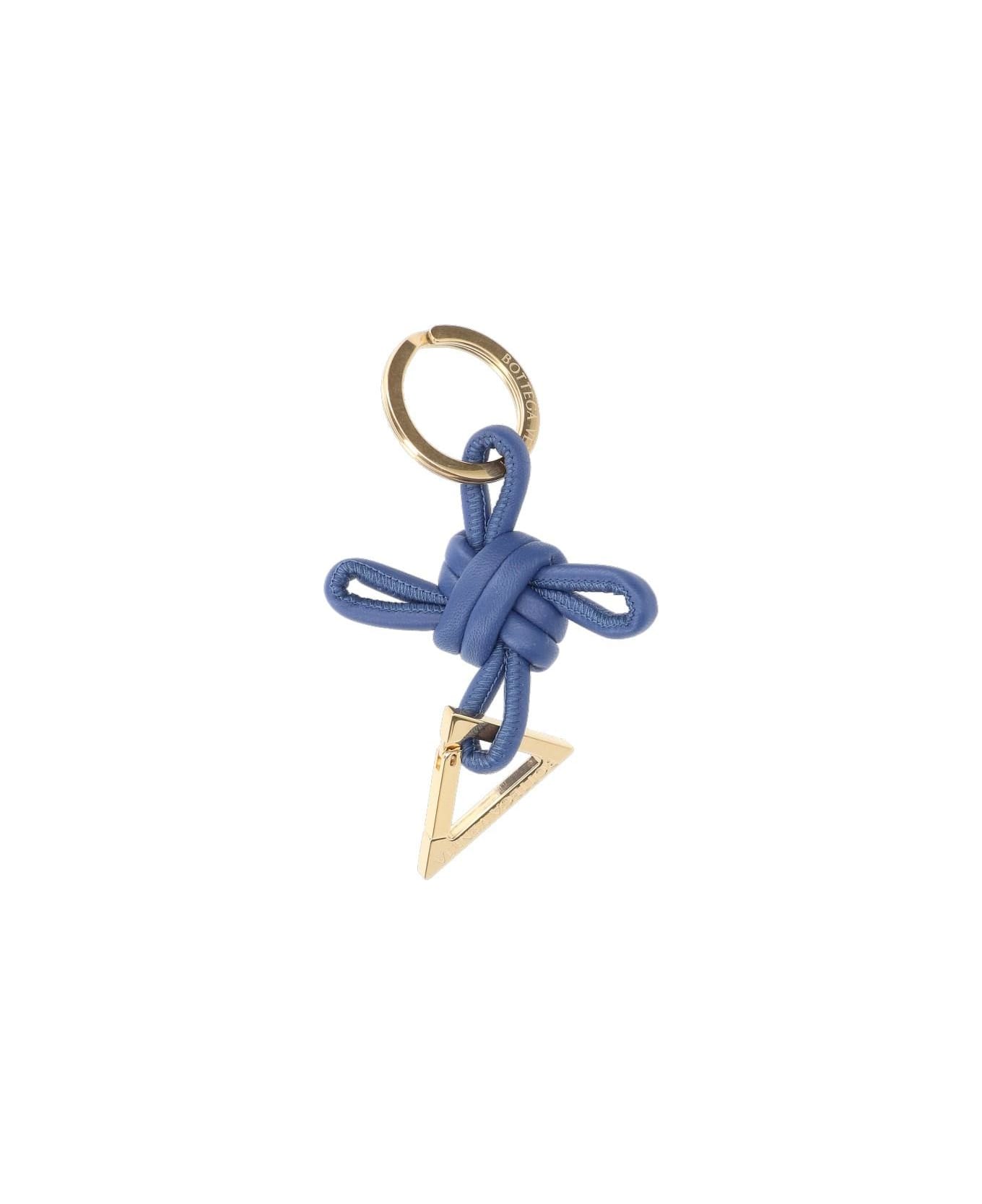 Bottega Veneta 'Triangle' Keychain, blue leather, two gold-plated metal snap hooks.