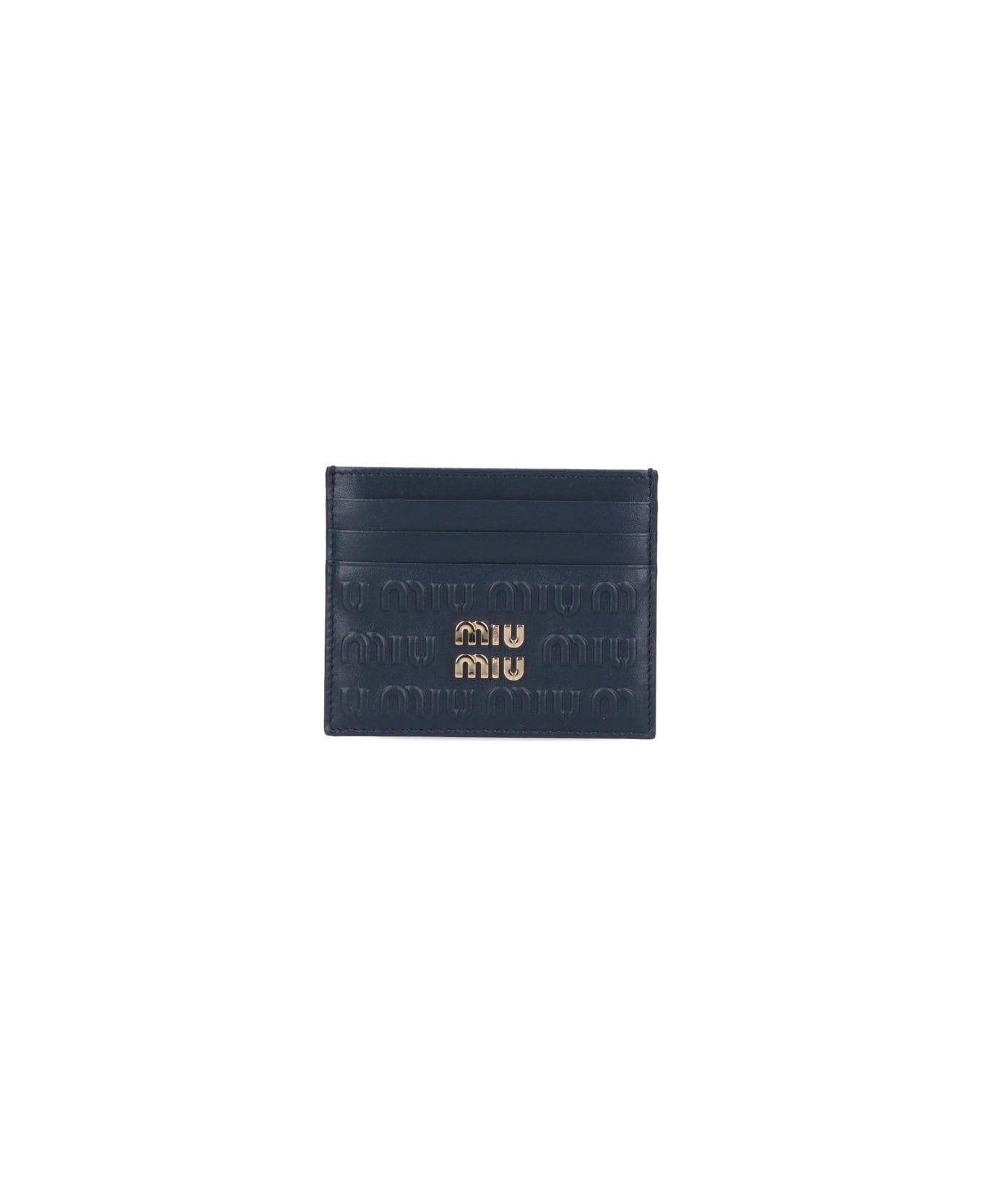 Miu Miu Logo Card Holder, leather, blue colour, all-over embossed logo motif, three card slots front and back, one flat top pocket, gold-coloured metallic logo detail on front.
