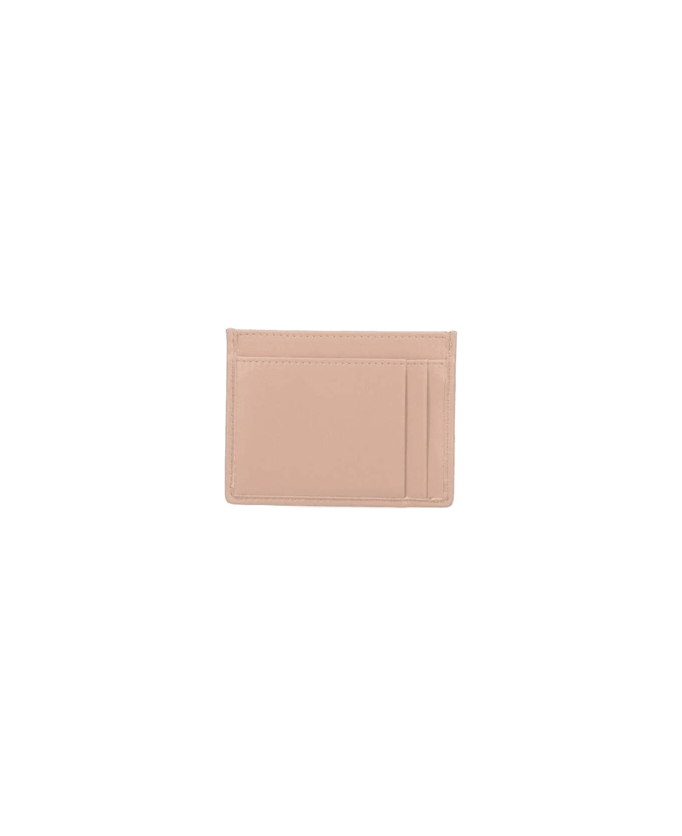Miu Miu matelass? card holder in beige leather with gold metal logo on the front, two card slots on the front, and four card slots on the back.