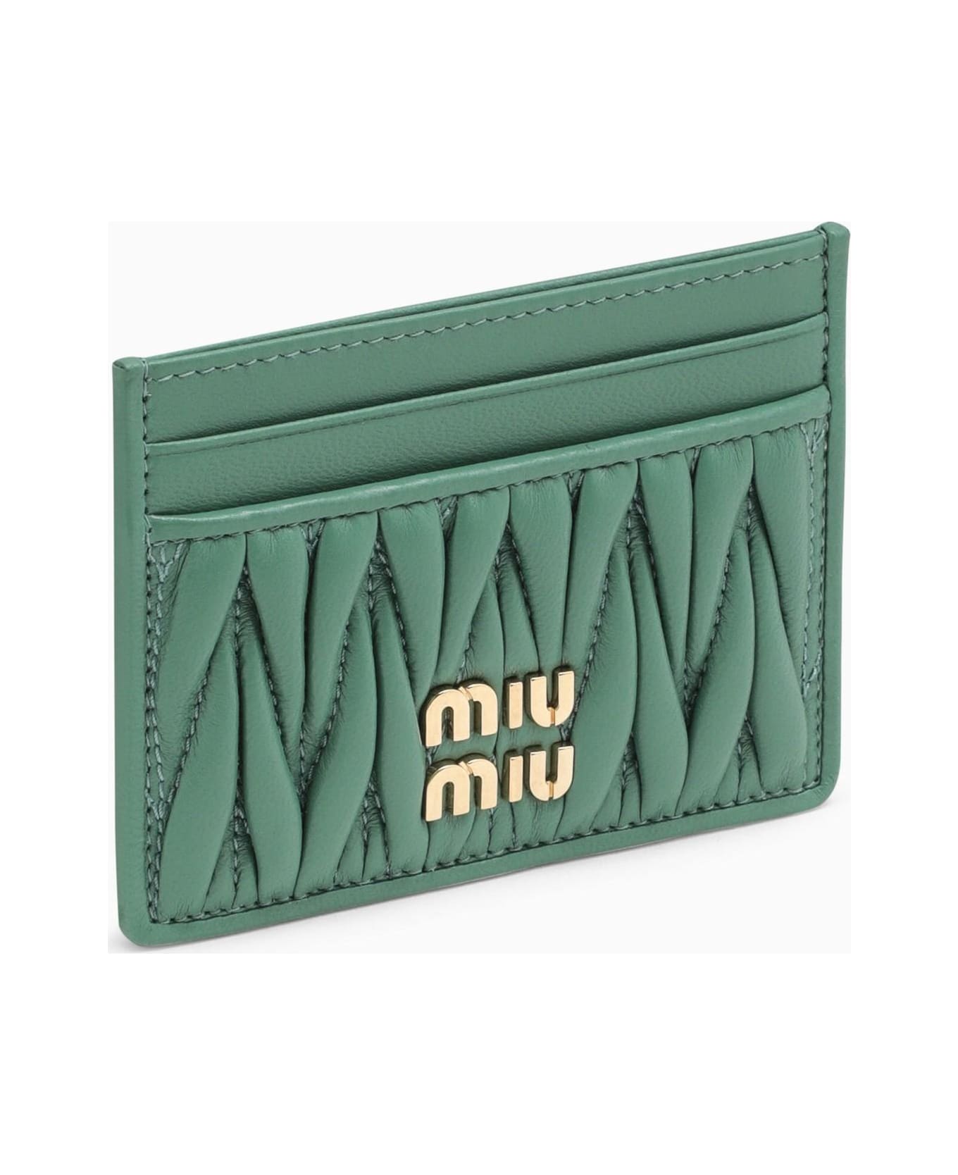 Credit card holder by Miu Miu in sage coloured nappa with matelass\u00e9 motif featuring front metal lettering logo, six card slots and moir\u00e9 and leather lining. Composition: 100% Leather