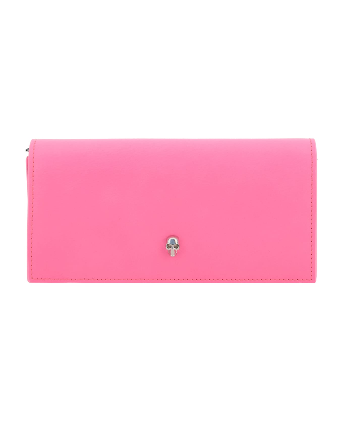 Calfskin shoulder wallet by alexander mcqueen, removable chain shoulder strap, matte effect design, iconic brand monogram press-stamped on back, iconic three-dimensional skull logo plaque applied on front, interior card slot, bill compartment, interior zippered compartment for closure. Composition: 100% Calf Leather Bos Taurus