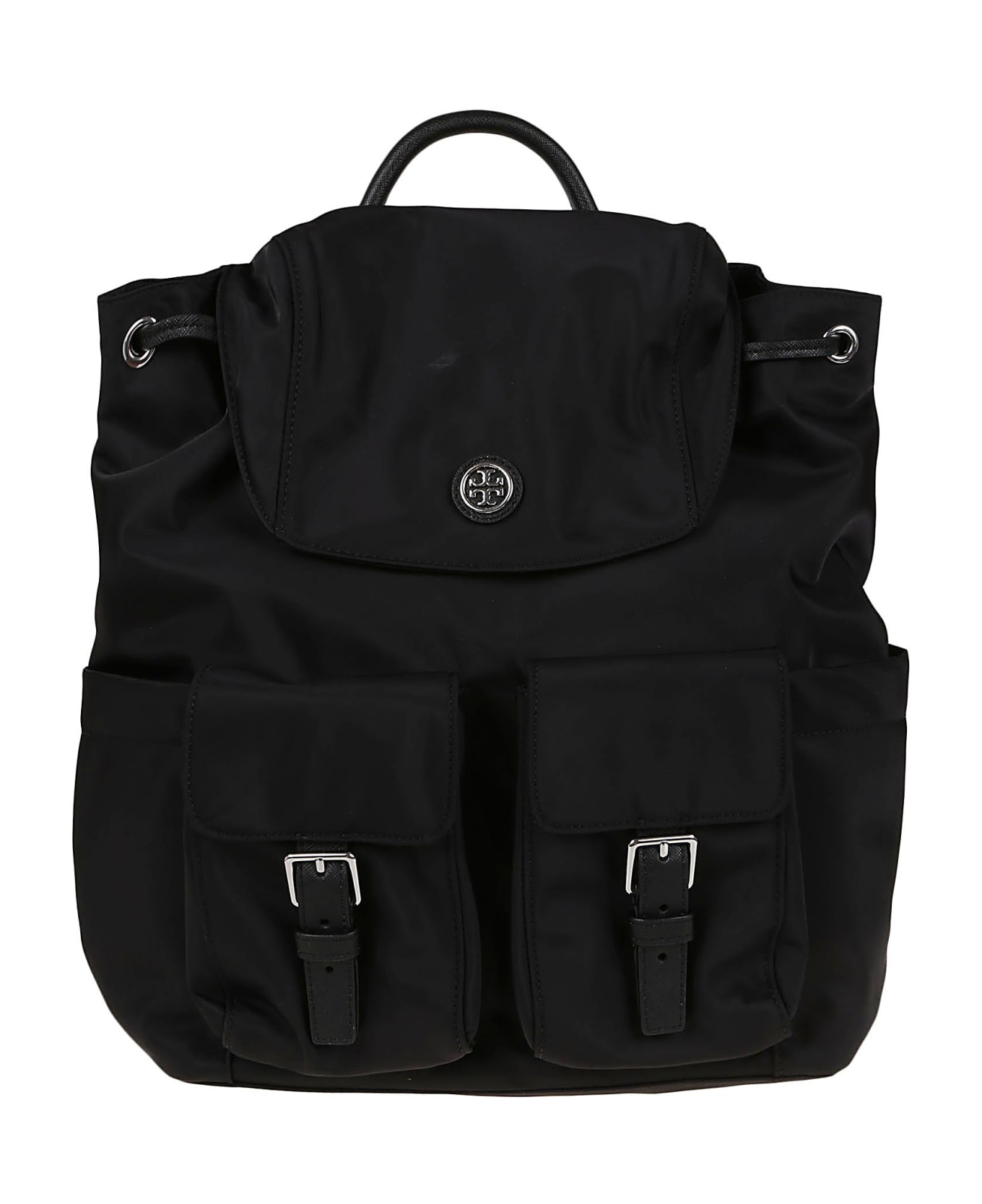 Black recycled nylon flap backpack from TORY BURCH features a recycled nylon construction with leather trim, distinctive Double T motif, flap closure, drawstring closure, main compartment, internal zip pocket, two front kangaroo pockets, top handle rounded and adjustable shoulder straps. Conscious: This product is made with at least 50% recycled or recovered materials. For recycled synthetic fabric products, we strongly recommend using a wash bag that captures microfibres, to ensure no microplastics are released in the process that can pollute the water.