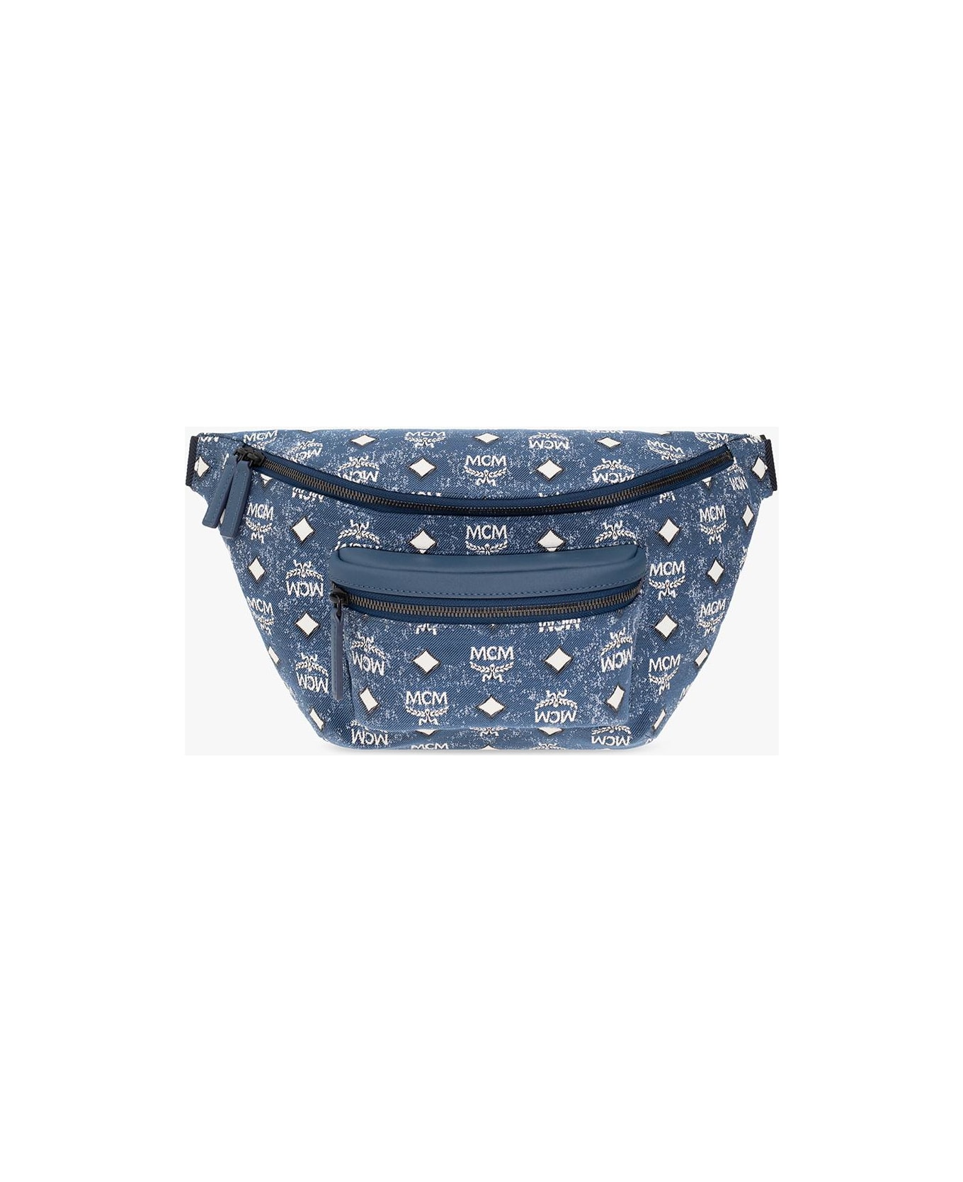 Blue 'Fursten' belt bag from MCM. Made of Italian denim with a jacquard monogram pattern and leather trimming, this model features zip fastening, front and back zip pocket, adjustable buckle belt and silver-tone metal hardware.