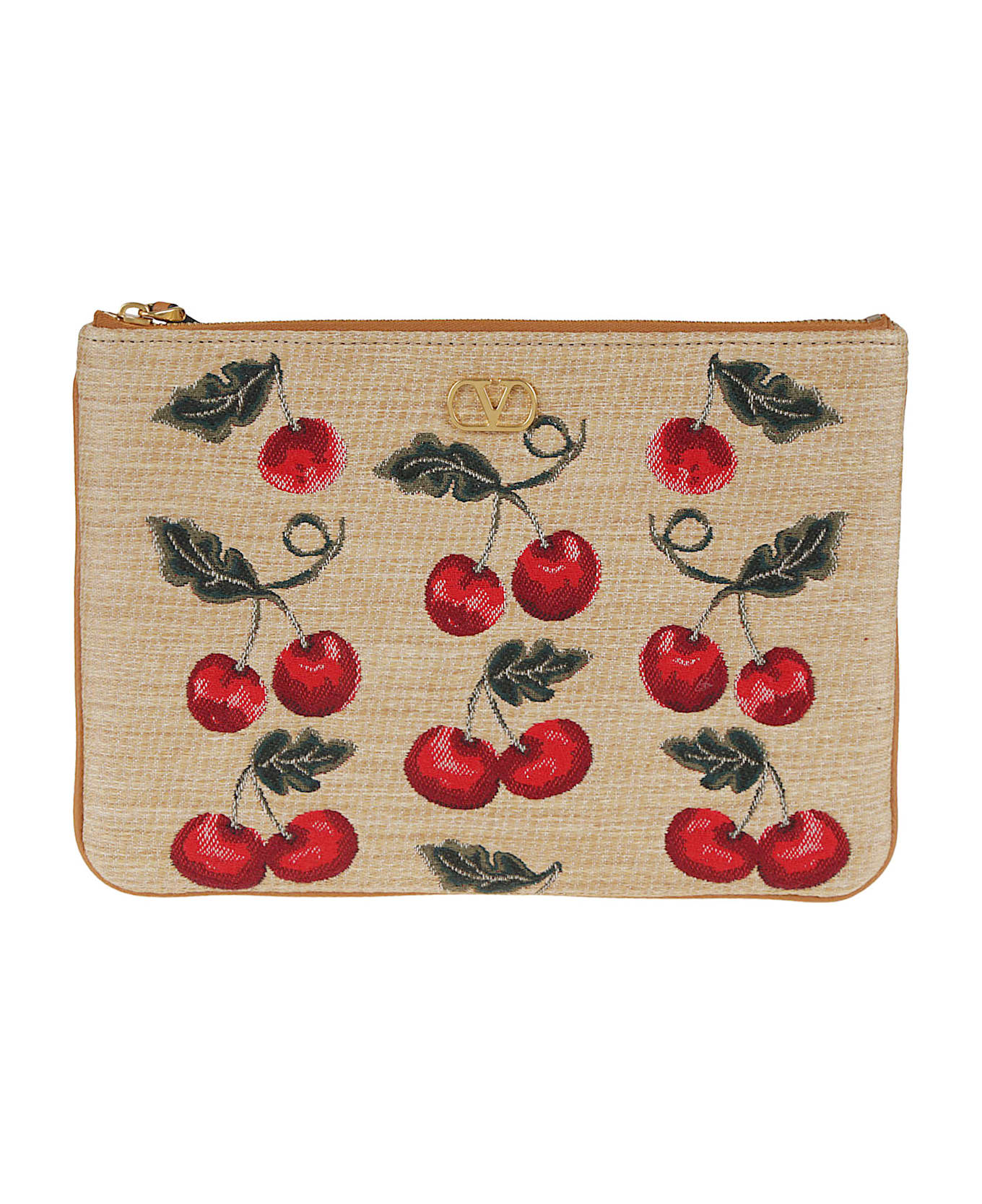 Vlogo Signature clutch bag in synthetic Jacquard Raffia by VALENTINO GARAVANI. Zip closure; Nappa lining. Interior: three card slots. Logo detail and metal parts in antiqued Brass finish and Cherryfic motif.