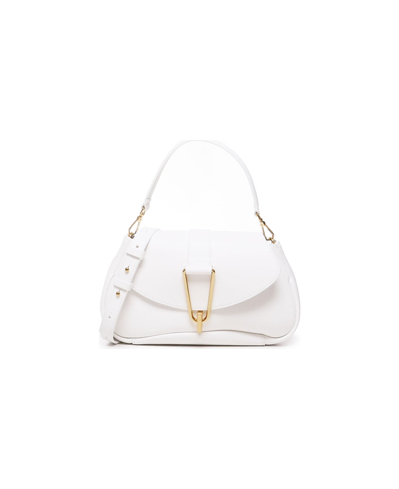 -Hand and shoulder portability -Grained leather -Closure with maxi metal pick and twist -Adjustable and removable leather shoulder strap -Internal pocket -Compartment closed with zip -Eco-leather interior -Gold galvanic -Gold stamp logo -Dimensions: 27x17x7 cm -Colour: White