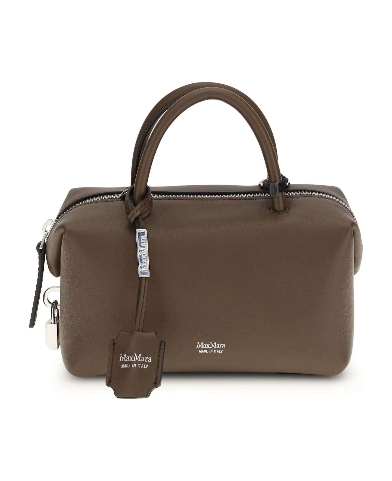 The holdalls leather handbag by max mara is an elegant and versatile accessory, crafted from smooth calfskin and enhanced by the laminated logo print on the front. featuring two round leather handles and a matching removable shoulder strap, it offers a variety of ways to carry it. the zip closure ensures practicality, while the removable leather keyring accessory completes the design with a functional and refined detail.