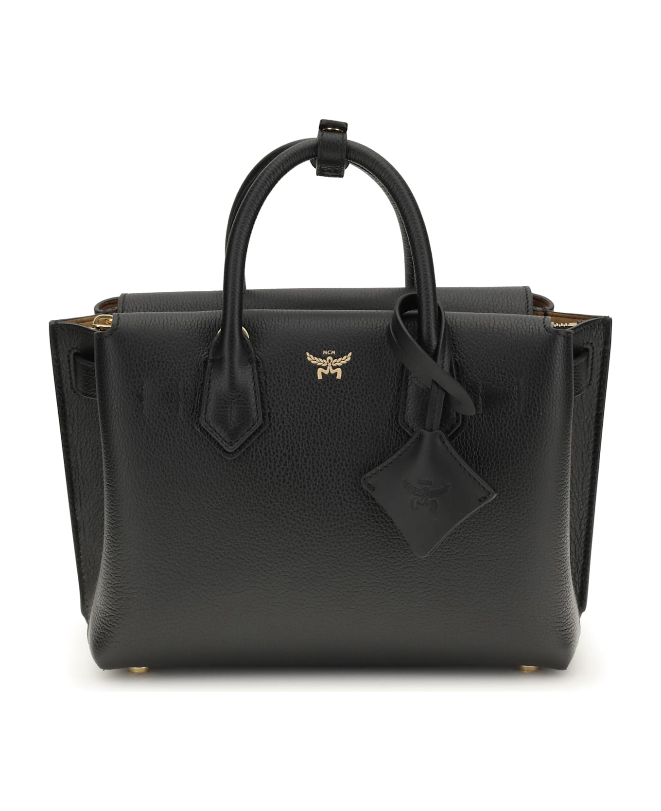 The milla handbag by mcm features a trapezoidal silhouette that gently flares upward. equipped with two handles and a shoulder strap, it can be worn by hand, on the forearm or over the shoulder with great versatility. gold details, including protective feet, exclusive closure and central "mode creation munich" logo, add elegance, while discreet stitching and contrasting pink piping define a refined, minimalist design.