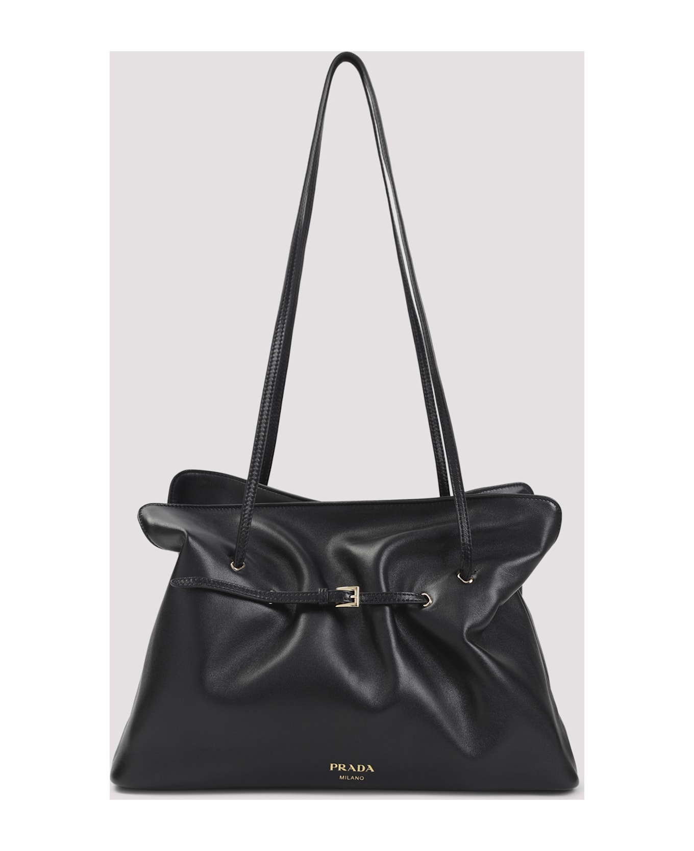 Prada Dada Black Lamb Leather Handbag. Crafted from black lamb leather, featuring gold-toned hardware, a soft gathered construction with a belted detail, top handles, a front logo, a concealed magnetic fastening, and an inner pocket.