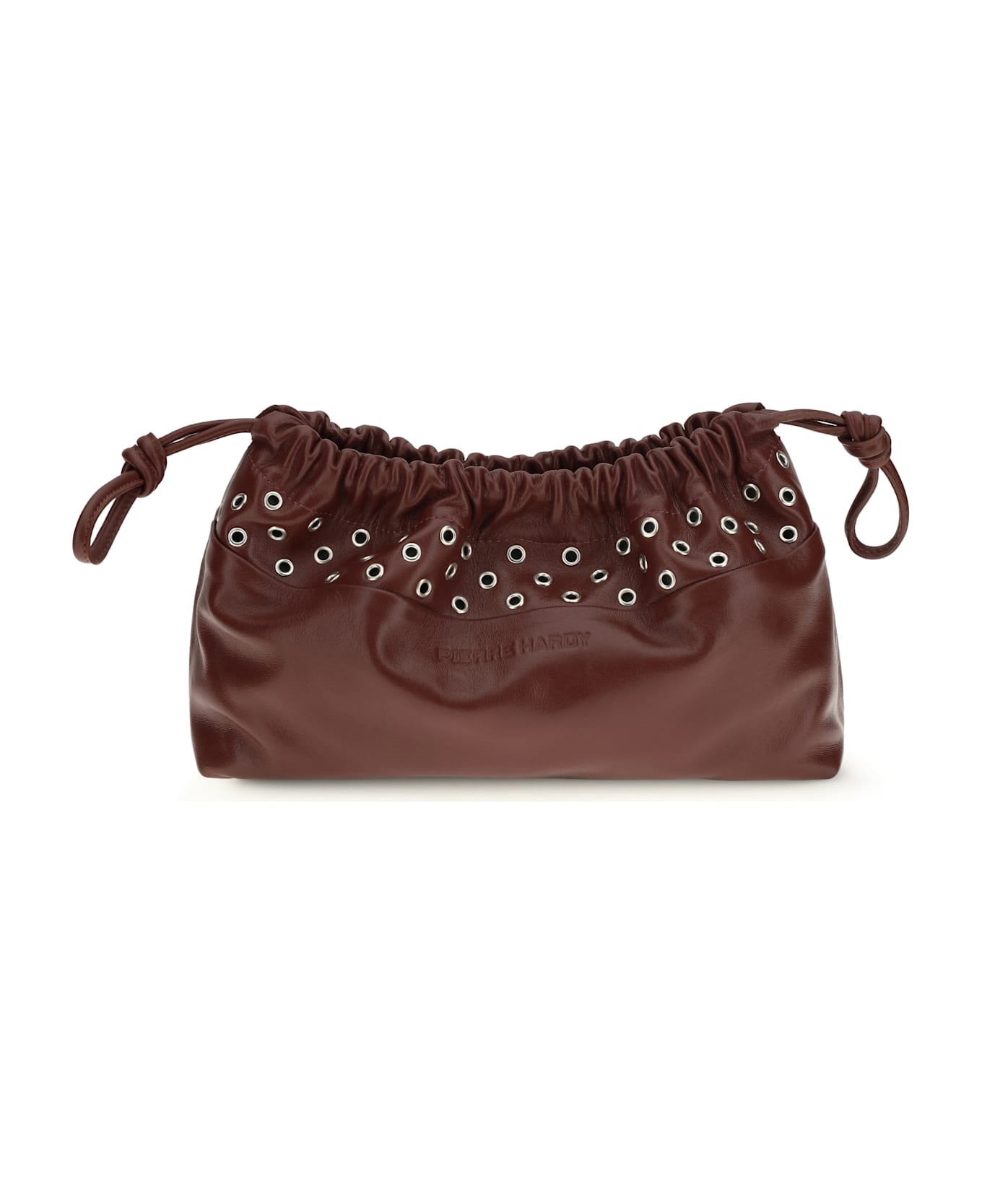 The double clutch with eyelets by by pierre hardy is crafted from calfskin leather and stands out for its panel decorated with bold metal eyelets. featuring a leather drawstring closure, double magnetic closure, and detachable thin shoulder strap, it offers practicality and versatility. the embossed pierre hardy logo and interior pocket complete the design with a distinctive and refined touch.