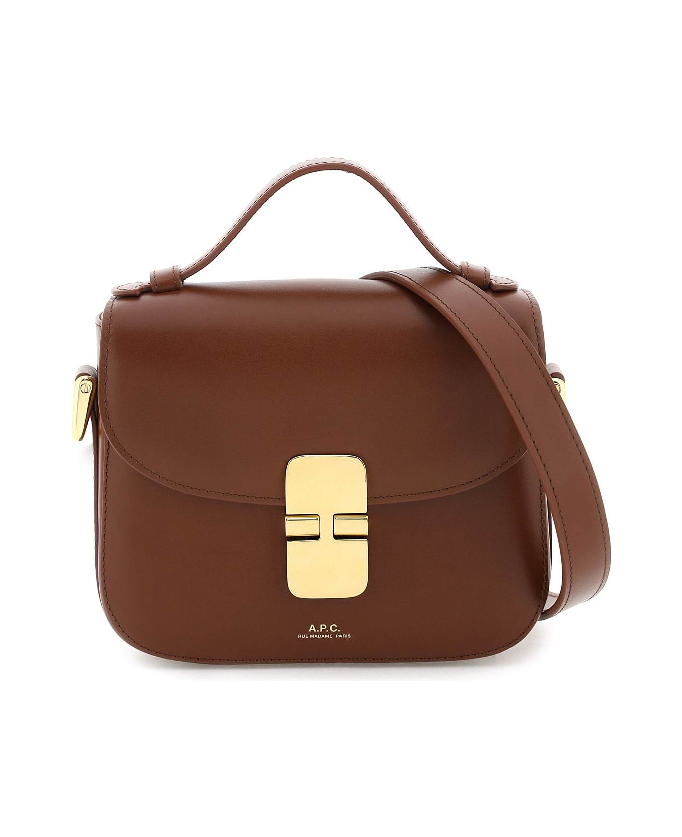 A. P. C. Grace Mini bag in smooth leather featuring flap with metal joint closure, gold-tone logo print on front, top handle and adjustable, detachable shoulder strap. Cotton lining, two flat compartment and a middle gusseted compartment. Gold-finished metalware.