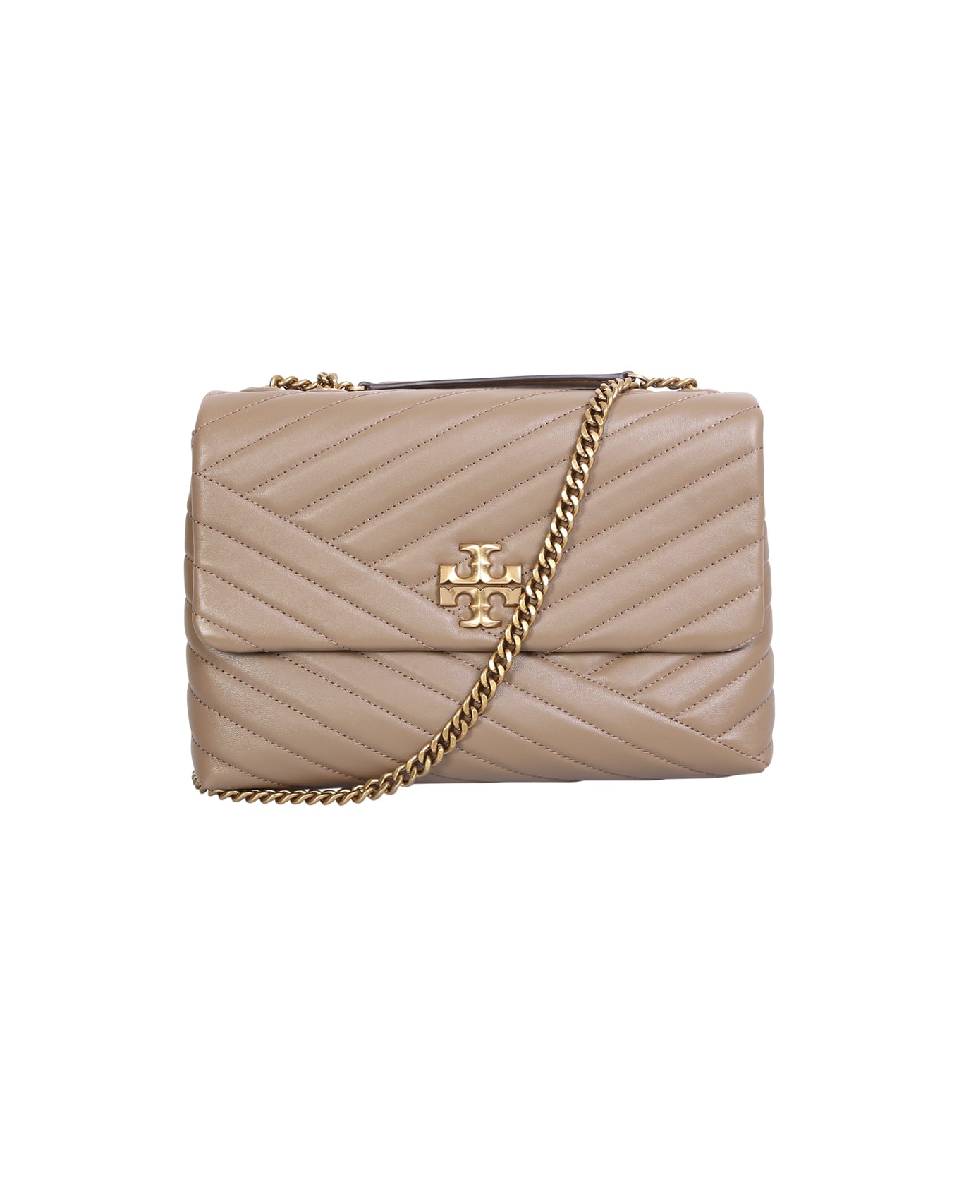 Foldover top. Signature double T logo plaque. Press stud fastening. Main compartment. Partitioned compartment. Internal zip fastening pocket. Internal logo patch. Two leather and chain link shoulder strap. Chevron quilted. Tonal stitching. Gold tone hardware. Color: beige