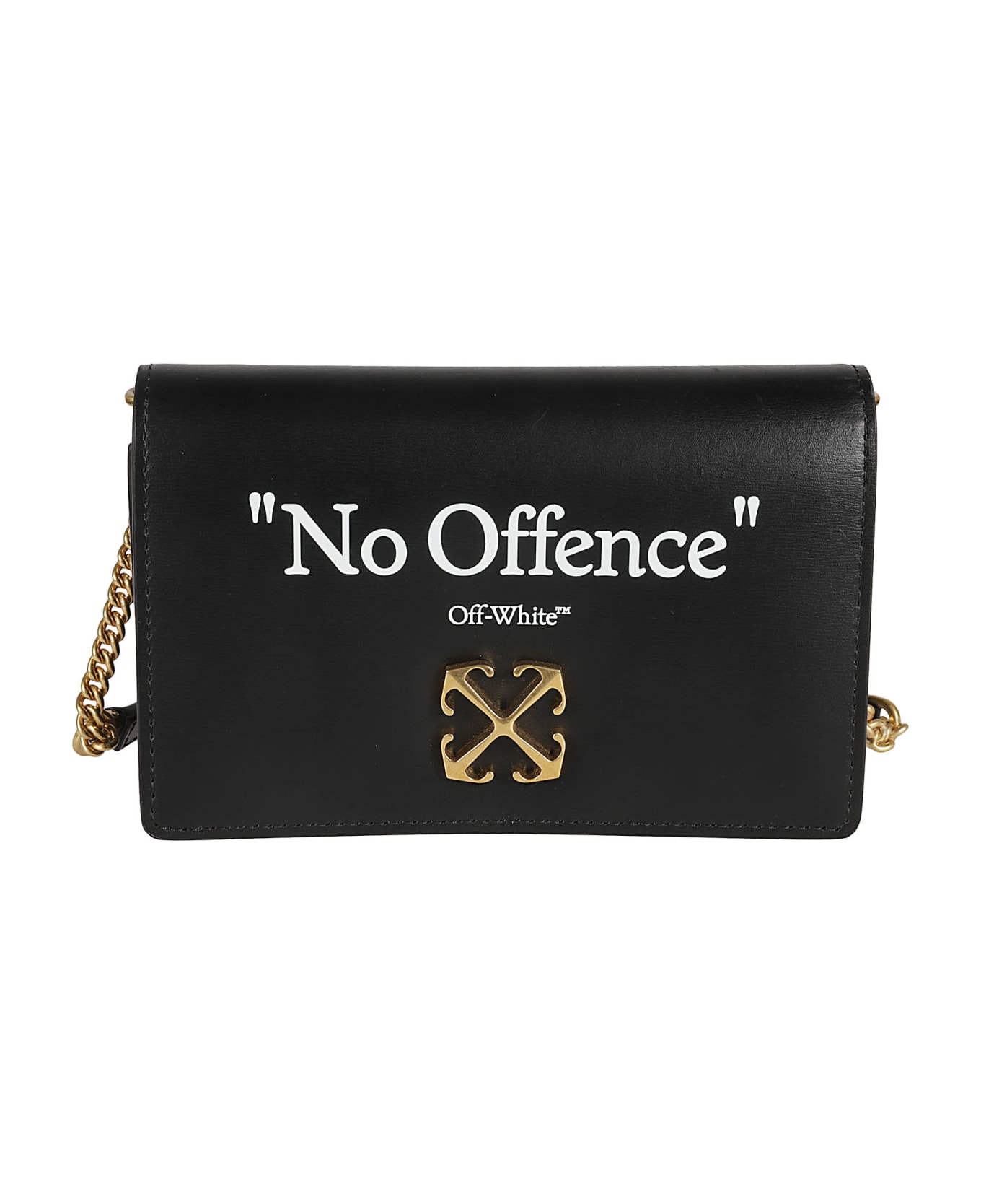 Jitney 0. 5 Woc Quote wallet from OFF-WHITE featuring black, calf leather, slogan print, signature Arrows motif, foldover top with magnetic fastening, slip pocket to the rear, logo stamp to the rear, internal zip-fastening pocket and detachable chain-link shoulder strap.