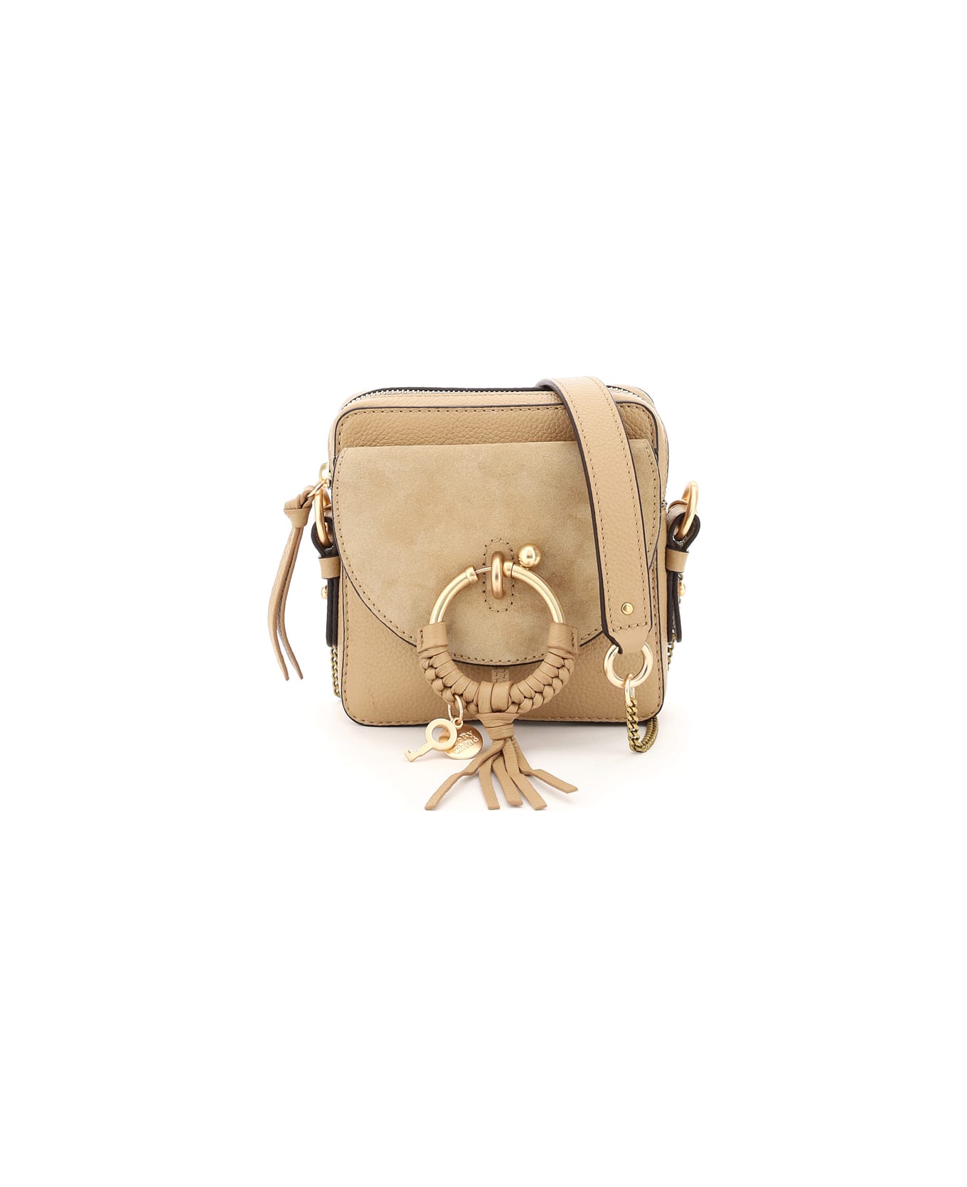 See By Chloé grain leather bag with chain strap and leather insert. It features a zip closure, front slit pocket with suede flap, magnetic button closure, maxi ring with leather tassel and charms. Fabric lining, inside credit card pocket, gold-tone hardware.