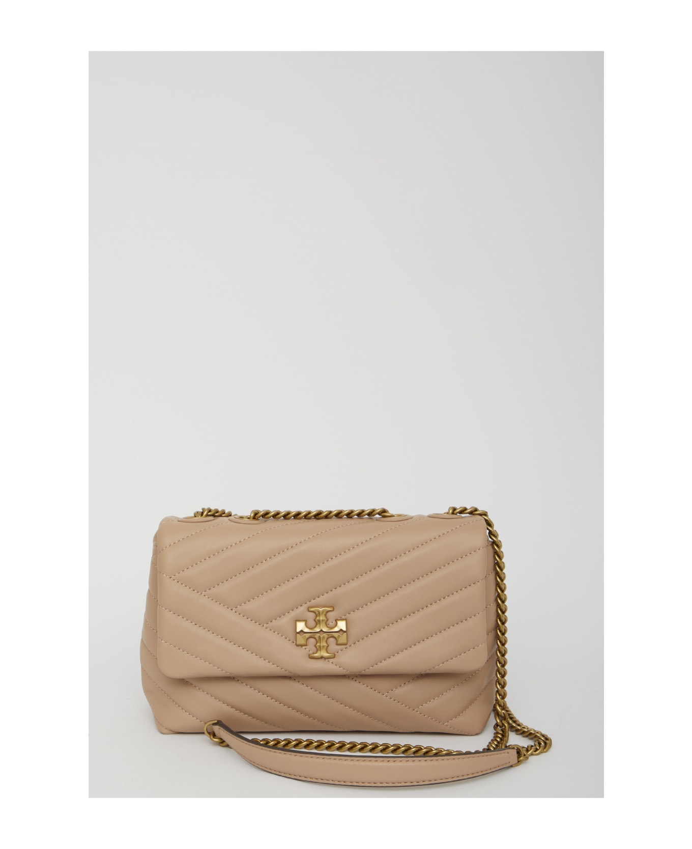 Small Kira bag in soft powder pink chevron quilted leaher. It features gold-tone metal Double T logo on the front, adjustable leather and chain shoulder strap, flap with magnetic closure, one main interior compartment, one interior zip pocket and two interior slip pockets.