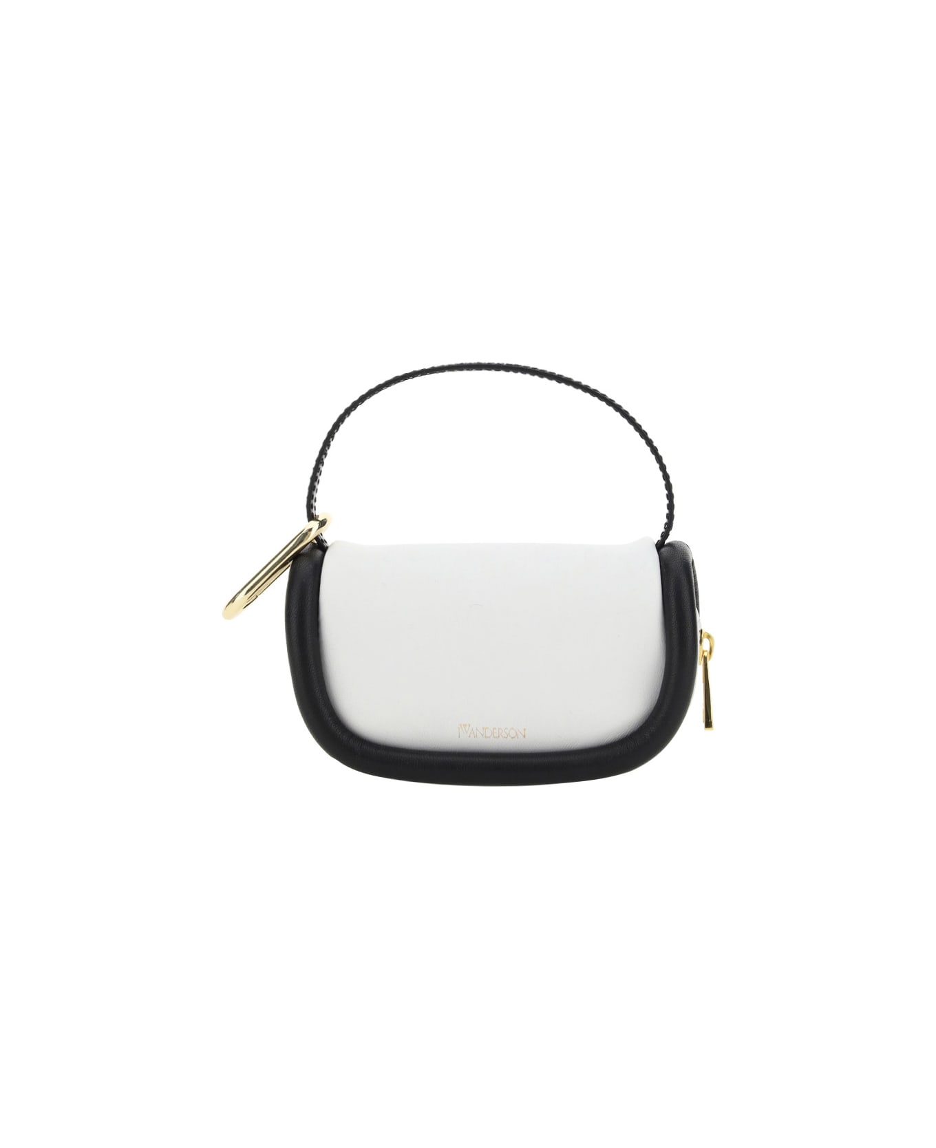 Calfskin the bumper shoulder bag by j. w. anderson, adjustable leather shoulder strap, tubular padding, contrasting brand signature press-stamped on front, zipper closure at base of bag, interior welt pocket, contrasting shiny crystal-covered outer profile.