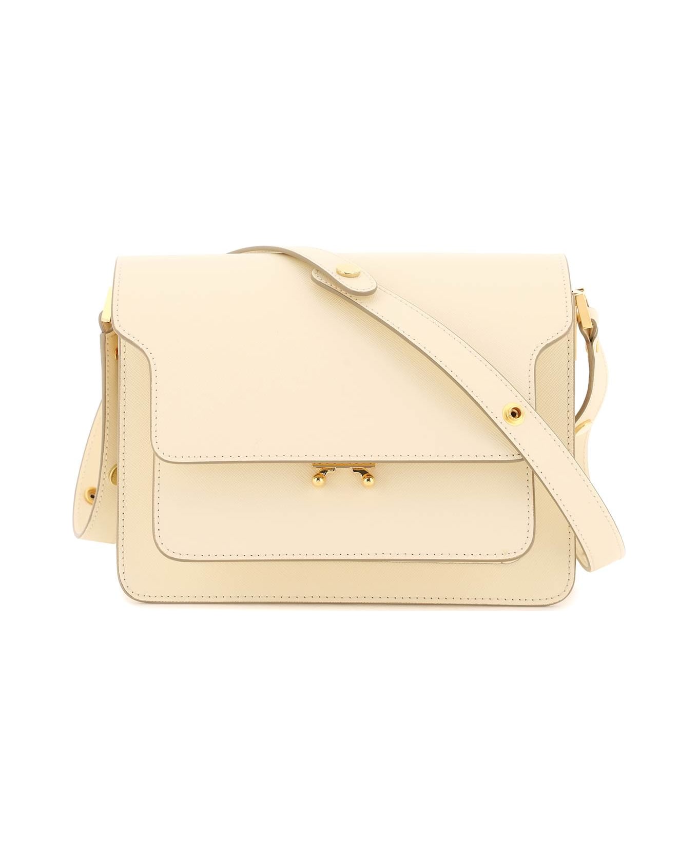 Marni Trunk medium bag in saffiano leather featuring an djustable shoulder strap with extention and flap with snap closure. Back slip pocket, four gusseted compartments, two inner zip pockets, fabric lining. Gold-tone metalware. Composition: 100% LH