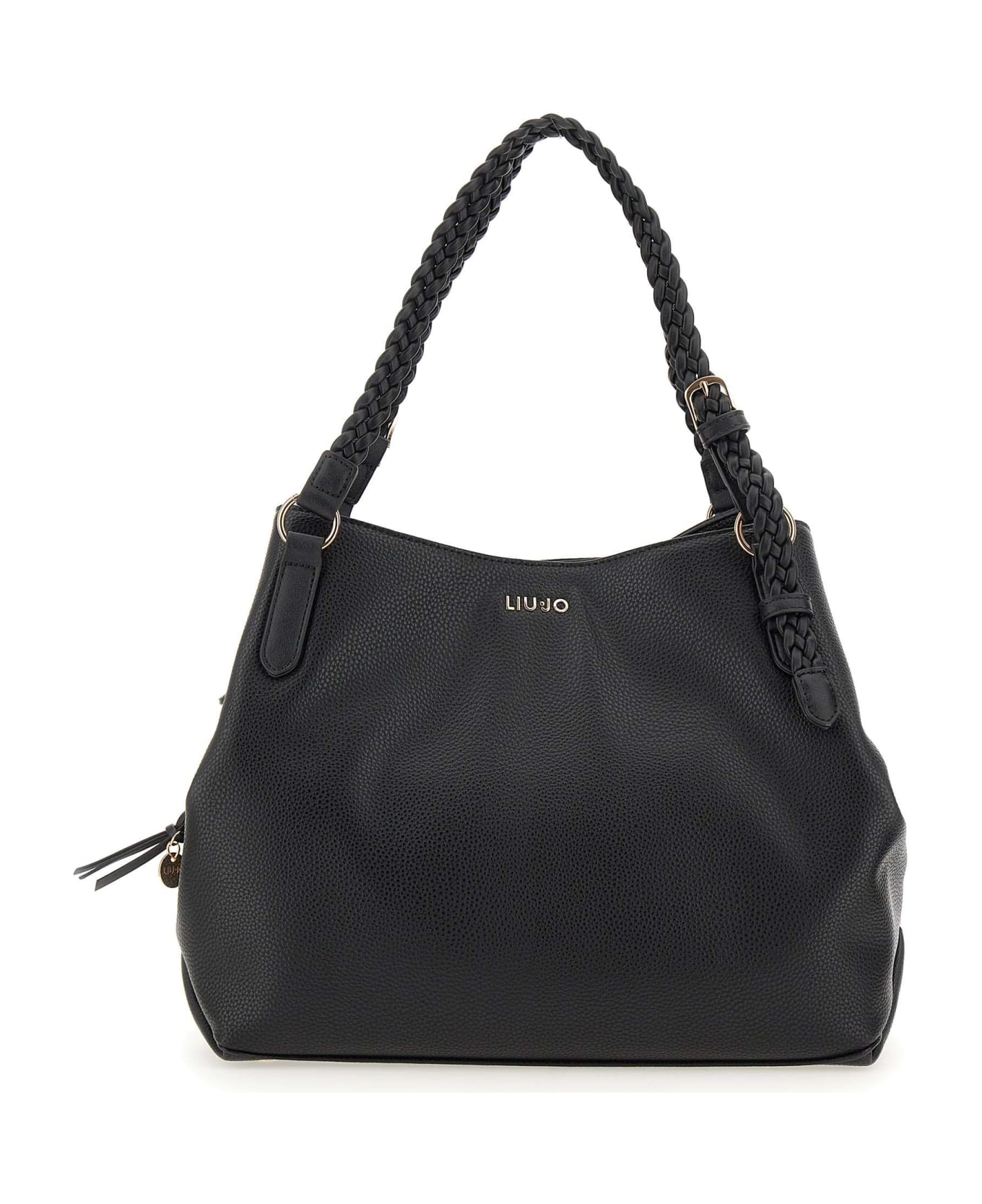 Shoulder bag Liu-Jo "Campanula", black, eco-sustainable in Pu, hem feet in metal, magnetic fastening, double handle with adjustable intertwining, 60cm long adjustable and removable shoulder strap, gold hardware, front gold logo, three internal compartments, central one with zip, animalier lining. Dimensions: height 29cm, width 34cm, depth 14cm.