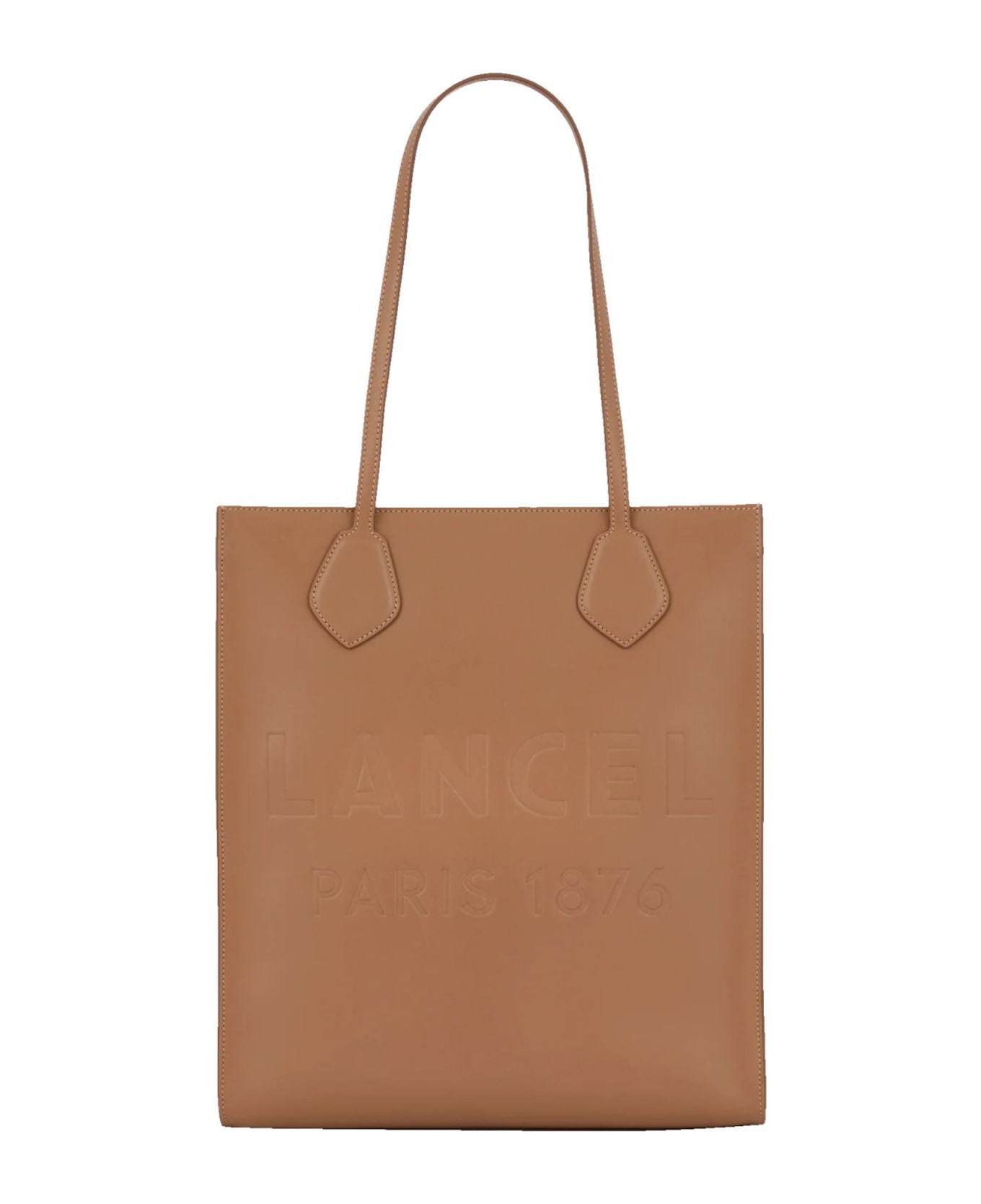Brown vertical tote bag, Smooth cowhide leather, Textile lining, Embossed 'LANCEL' logo, Two interior patch pockets, One inner zipper pocket, 33 x 37 x 10 cm