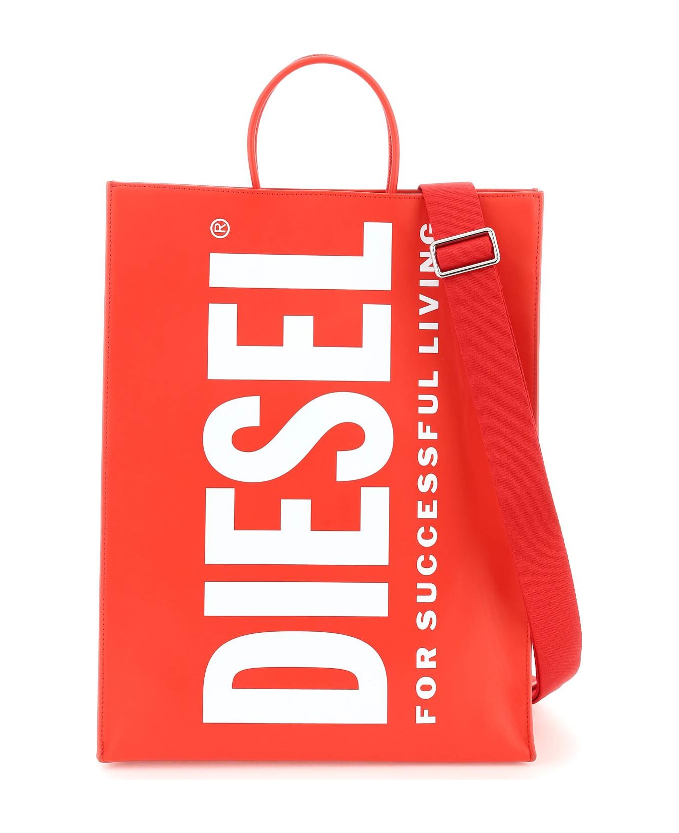 Diesel large tote bag crafted in smooth leather with contrasting logo print on front, characterized by the design inspired by the paper bag used in the brand's stores. Double tubular top handles in leather, adjustable and detachable webbing strap, magnetic closure, fabric lining and one inner open flat pocket. Silver-finished metalware.