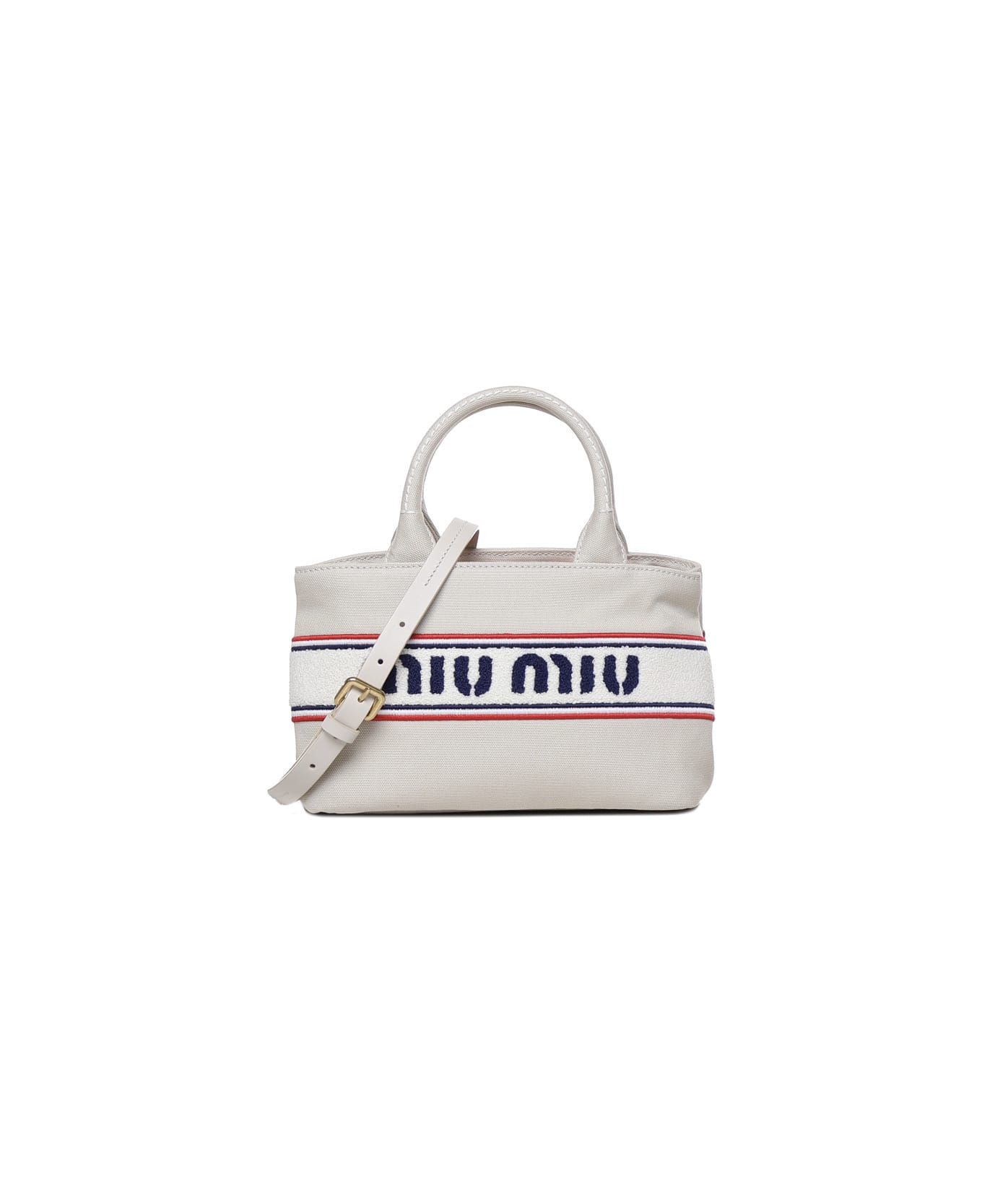 Gesso Embroidered Canvas Bag from Miu Miu -Embroidered canvas bag -Macro contrasting stripe with jacquard lettering logo -Top handles -Adjustable and removable shoulder strap -Two internal open pockets -Embroidered logo on the front -Measurements: 22x15x12 cm -Made in Italy -Colour: Chalk -100% Cotton