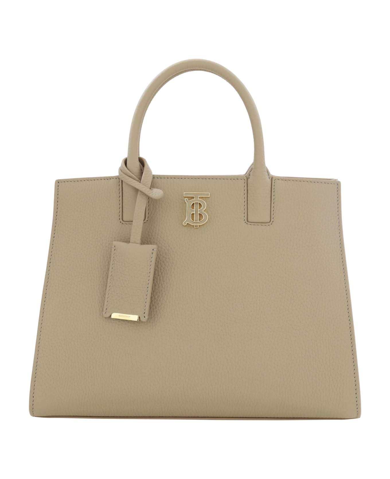 Calfskin frances handbag by burberry, two rigid leather handles, removable logo tag on the handle, removable leather flat shoulder strap on the top, closure on the side panels with magnetic mechanism, metallic patch with iconic brand monogram applied on the front, textured leather design.