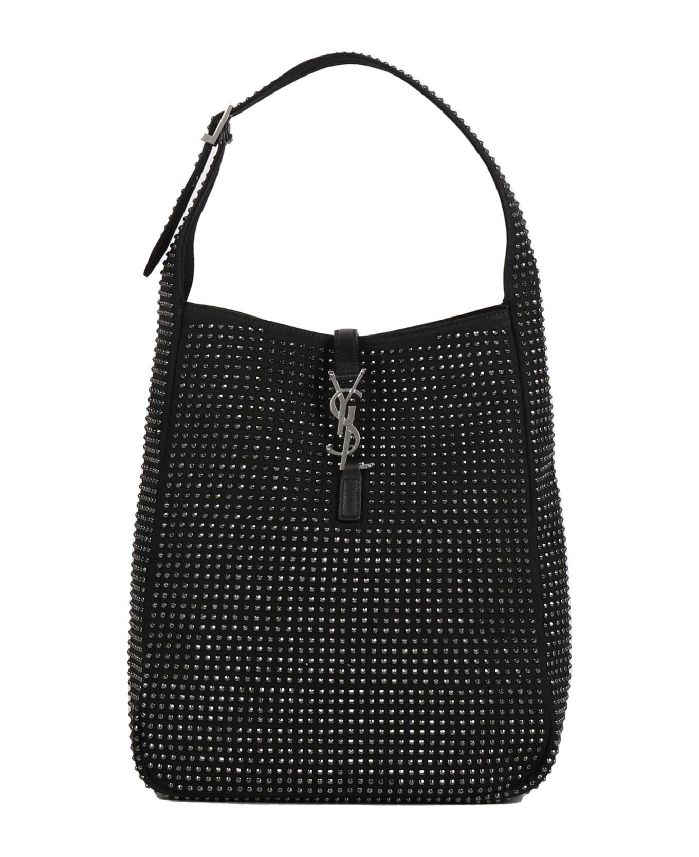 Black Hobo Bag "le 5 à 7 Soft" In Canvas, Leather And Studs from Saint Laurent -Cassandre hobo bag -Closure with hook with intertwined YSL initials in metal -Decorated with all-over studs -Measurament: 30x22x8 CM -Silver-coloured metal parts -Inside: two main compartments, one zip pocket -Made in Italy -Colour: Black --30% Cotton, 30% Calfskin, 30% Studs, 10% Brass