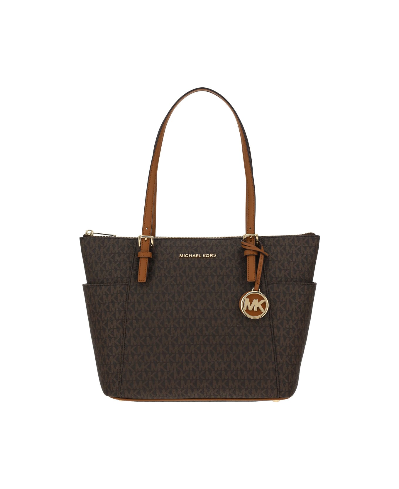 Jet set item tote bag by michael kors, double flat top leather handle, metal plaque with iconic brand signature embossed applique on front, iconic all-over contrasting repeated brand monogram, top zipper closure, main compartment, two welt compartments on side panels, interior welt pocket.